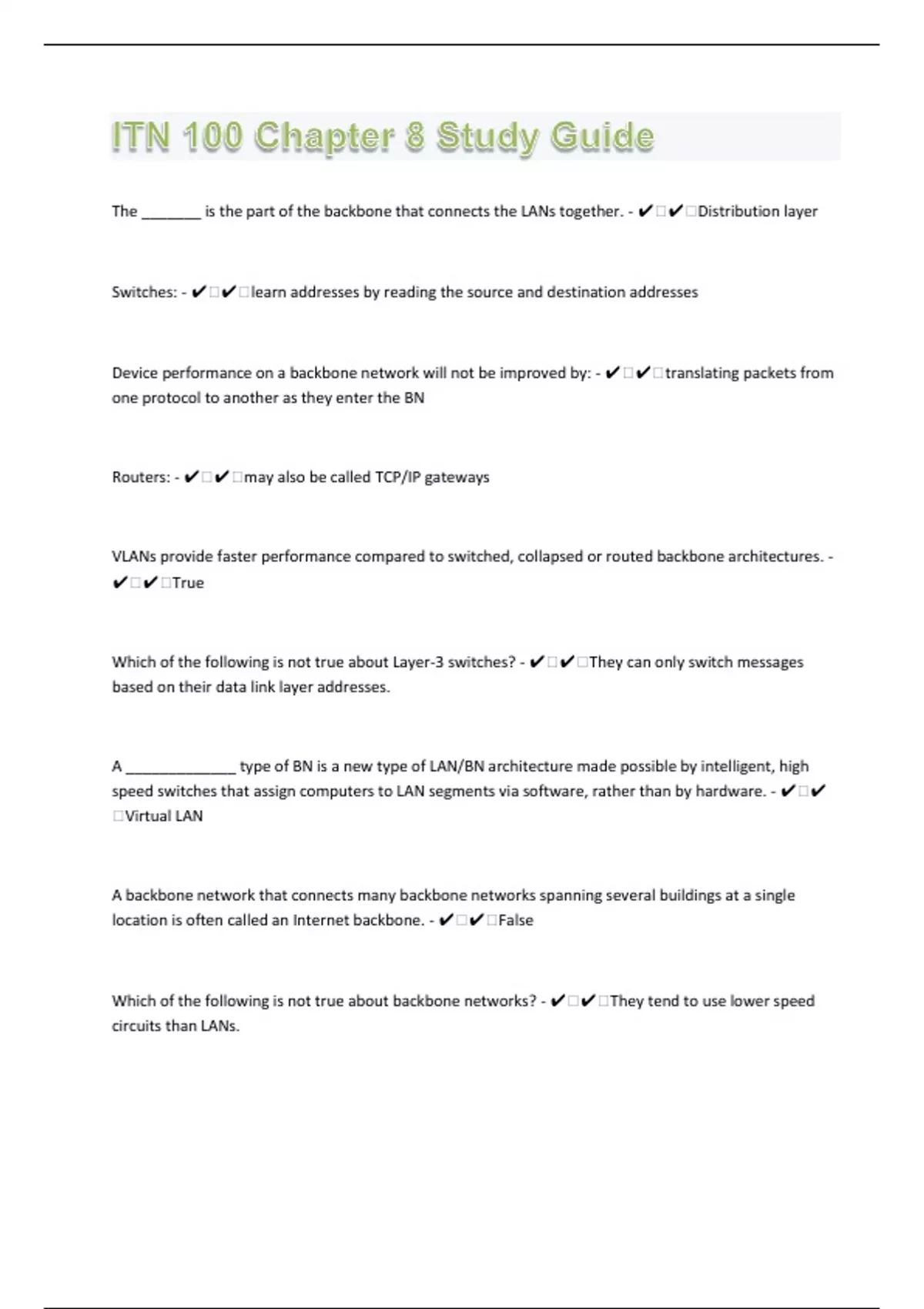 The _______ is the part of the backbone that connects the LANs together. - ️️Distribution layer Switches: - ️️learn addresses by reading the source and destination addresses Device performance on a backbone network will not be improved by: - ️️translating packets from one protocol to another as they enter the BN Routers: - ️️may also be called TCP/IP gateways VLANs provide faster performance compared to switched, collapsed or routed backbone architectures. - ️️True Which of the following is not true about Layer-3 switches? - ️️They can only switch messages based on their data link layer addresses. A _____________ type of BN is a new type of LAN/BN architecture made possible by intelligent, high speed switches that assign computers to LAN segments via software, rather than by hardware. - ️️Virtual LAN A backbone network that connects many backbone networks spanning several buildings at a single location is often called an Internet backbone. - ️️False Which of the following is not true about backbone networks? - ️️They tend to use lower speed circuits than LANs.
