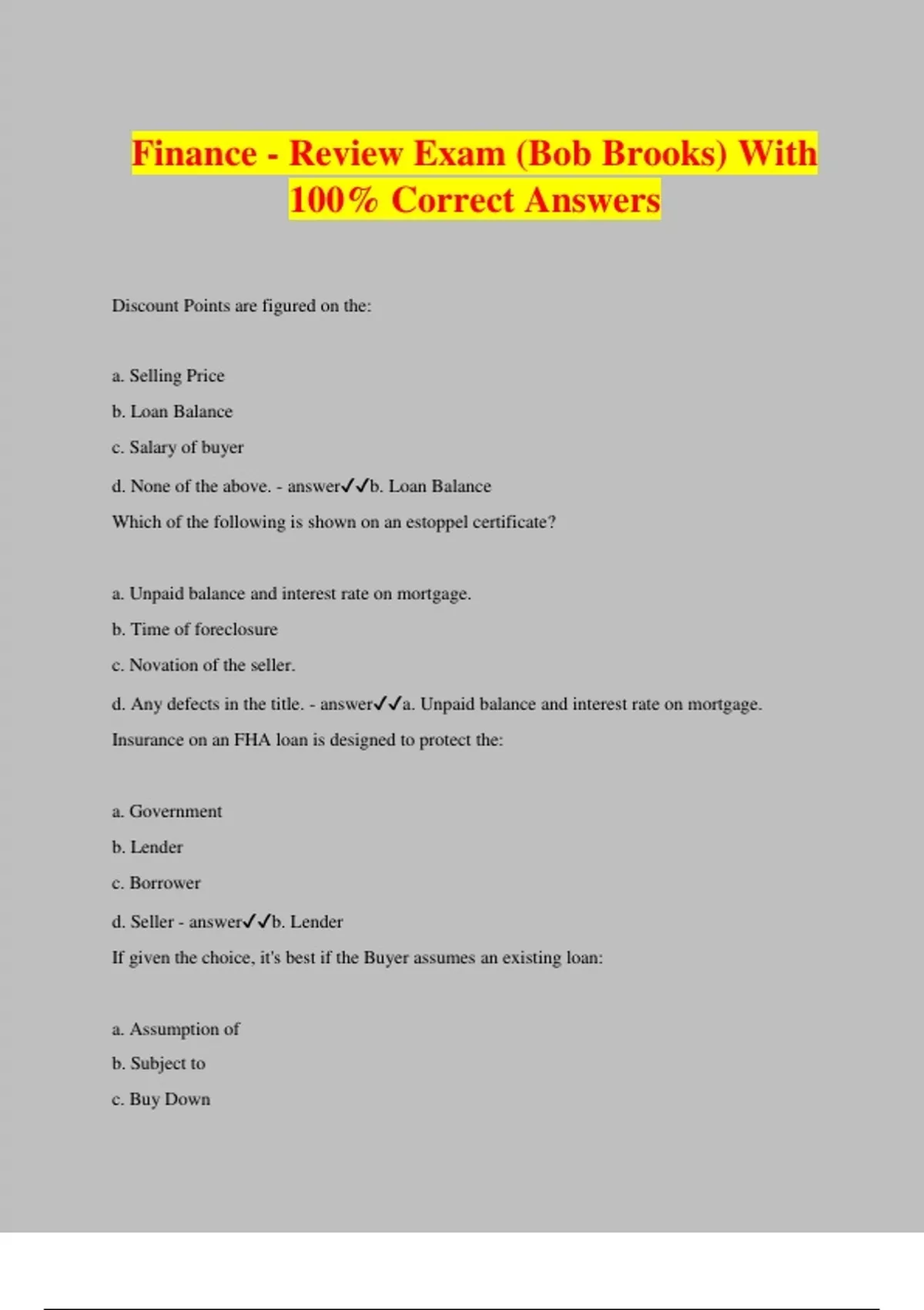 Finance - Review Exam (Bob Brooks) With 100% Correct Answers Discount Points are figured on the: a. Selling Price b. Loan Balance c. Salary of buyer d. None of the above. - answerb. Loan Balance Which of the following is shown on an estoppel certificate? a. Unpaid balance and interest rate on mortgage. b. Time of foreclosure c. Novation of the seller. d. Any defects in the title. - answera. Unpaid balance and interest rate on mortgage. Insurance on an FHA loan is designed to protect the: a. Government b. Lender c. Borrower d. Seller - answerb. Lender If given the choice, it's best if the Buyer assumes an existing loan: a. Assumption of b. Subject to c. Buy Down d. None of the above. - answerb. Subject to Two discount points charged on an FHA loan of $50,000 would amount to: a. $500 b. $700 c. $1,000 d. $2,000 - answerc. $1,000 To compute the dollar value of a loan discount, each point is equal to: a. 1% of the amount to be loaned. b. 1% of the down payment. c. 1% of the appraised value. d. 1% of the sales price. - answera. 1% of the amount to be loaned. The document from a lender that gives the status of the loan such as loan balance, interest, time remaining and note is the: a. Loan certificate b. Estoppel certificate c. Equity certificate d. Mortgage certificate - answerb. Estoppel certificate PMI is required when a Buyer pays le