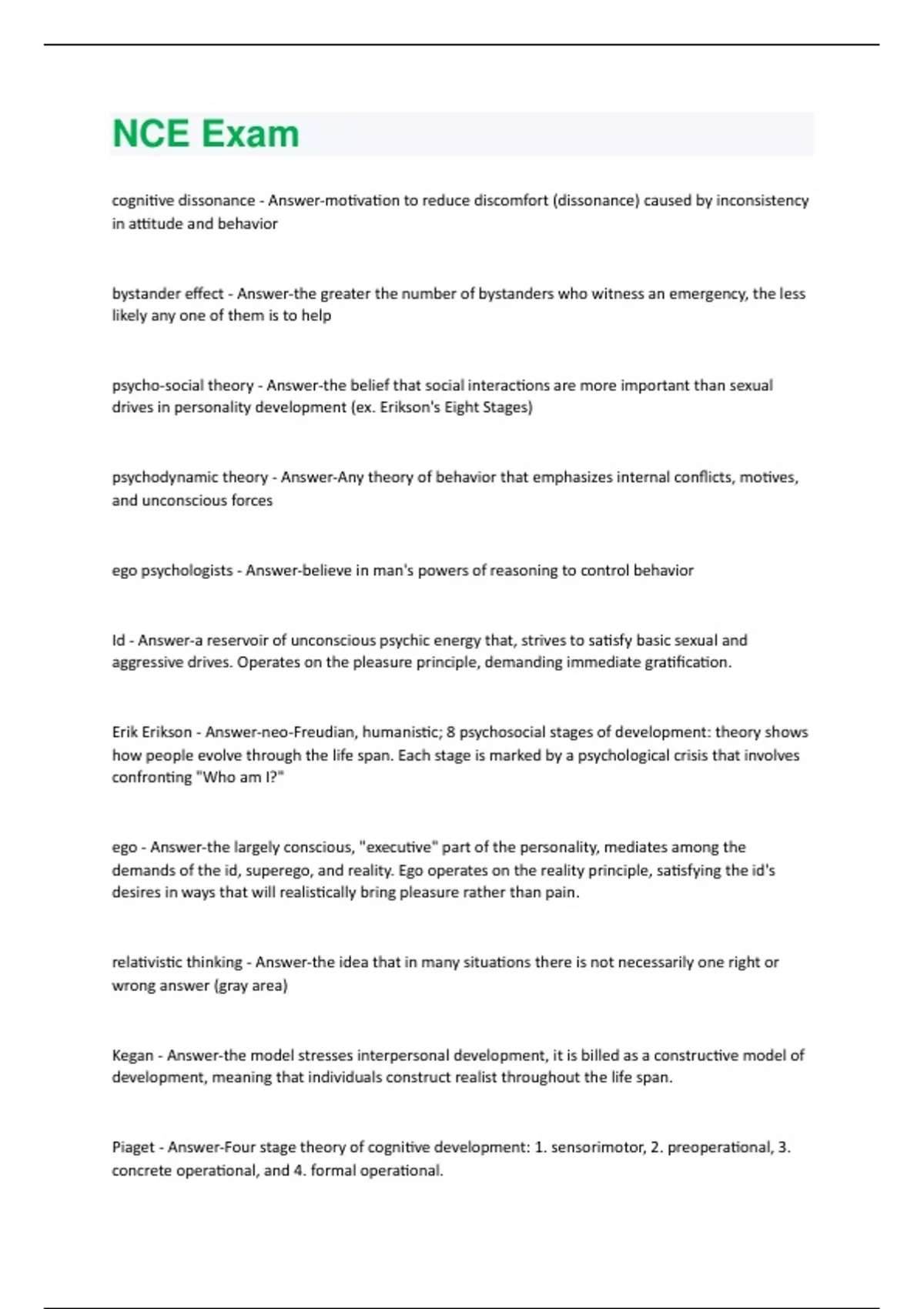 cognitive dissonance - Answer-motivation to reduce discomfort (dissonance) caused by inconsistency in attitude and behavior bystander effect - Answer-the greater the number of bystanders who witness an emergency, the less likely any one of them is to help psycho-social theory - Answer-the belief that social interactions are more important than sexual drives in personality development (ex. Erikson's Eight Stages) psychodynamic theory - Answer-Any theory of behavior that emphasizes internal conflicts, motives, and unconscious forces ego psychologists - Answer-believe in man's powers of reasoning to control behavior Id - Answer-a reservoir of unconscious psychic energy that, strives to satisfy basic sexual and aggressive drives. Operates on the pleasure principle, demanding immediate gratification. Erik Erikson - Answer-neo-Freudian, humanistic; 8 psychosocial stages of development: theory shows how people evolve through the life span. Each stage is marked by a psychological crisis that involves confronting "Who am I?" ego - Answer-the largely conscious, "executive" part of the personality, mediates among the demands of the id, superego, and reality. Ego operates on the reality principle, satisfying the id's desires in ways that will realistically bring pleasure rather than pain. relativistic thinking - Answer-the idea that in many situations there is not necessarily one right or wrong answer (gray area) Kegan - Answer-the model stresses interpersonal development, it is billed as a constructive model of development, meaning that individuals construct realist throughout the life span. Piaget - Answer-Four stage theory of cognitive development: 1. sensorimotor, 2. preoperational, 3. concrete operational, and 4. formal operational.Piaget - Answer-findings based on his own children conservation - Answer-the principle that properties such as mass, volume, and number remain the same despite changes in the forms of objects concrete operational stage - Answer-in Piaget's theory, the stage of cognitive development (from 7 to 11 years of age) during which children gain the mental operations that enable them to think logically about concrete events Lev Vygotsky's Theory - Answer-stages unfold due to educational intervention