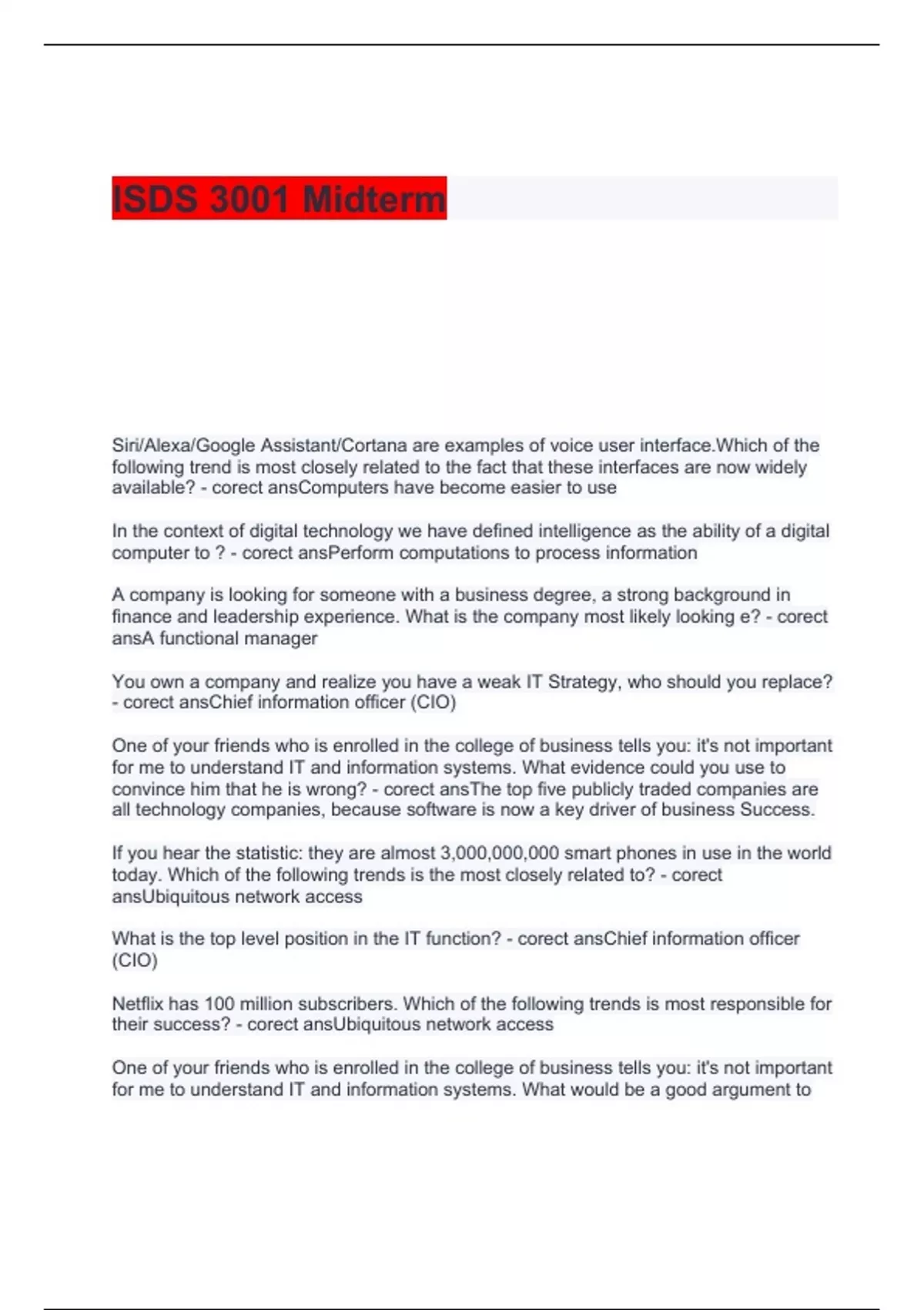 Siri/Alexa/Google Assistant/Cortana are examples of voice user interface.Which of the following trend is most closely related to the fact that these interfaces are now widely available? - corect ansComputers have become easier to use In the context of digital technology we have defined intelligence as the ability of a digital computer to ? - corect ansPerform computations to process information A company is looking for someone with a business degree, a strong background in finance and leadership experience. What is the company most likely looking e? - corect ansA functional manager You own a company and realize you have a weak IT Strategy, who should you replace? - corect ansChief information officer (CIO) One of your friends who is enrolled in the college of business tells you: it's not important for me to understand IT and information systems. What evidence could you use to convince him that he is wrong? - corect ansThe top five publicly traded companies are all technology companies, because software is now a key driver of business Success. If you hear the statistic: they are almost 3,000,000,000 smart phones in use in the world today. Which of the following trends is the most closely related to? - corect ansUbiquitous network access What is the top level position in the IT function? - corect ansChief information officer (CIO) Netflix has 100 million subscribers. Which of the following trends is most responsible for their success? - corect ansUbiquitous network access One of your friends who is enrolled in the college of business tells you: it's not important for me to understand IT and information systems. What would be a good argument to
