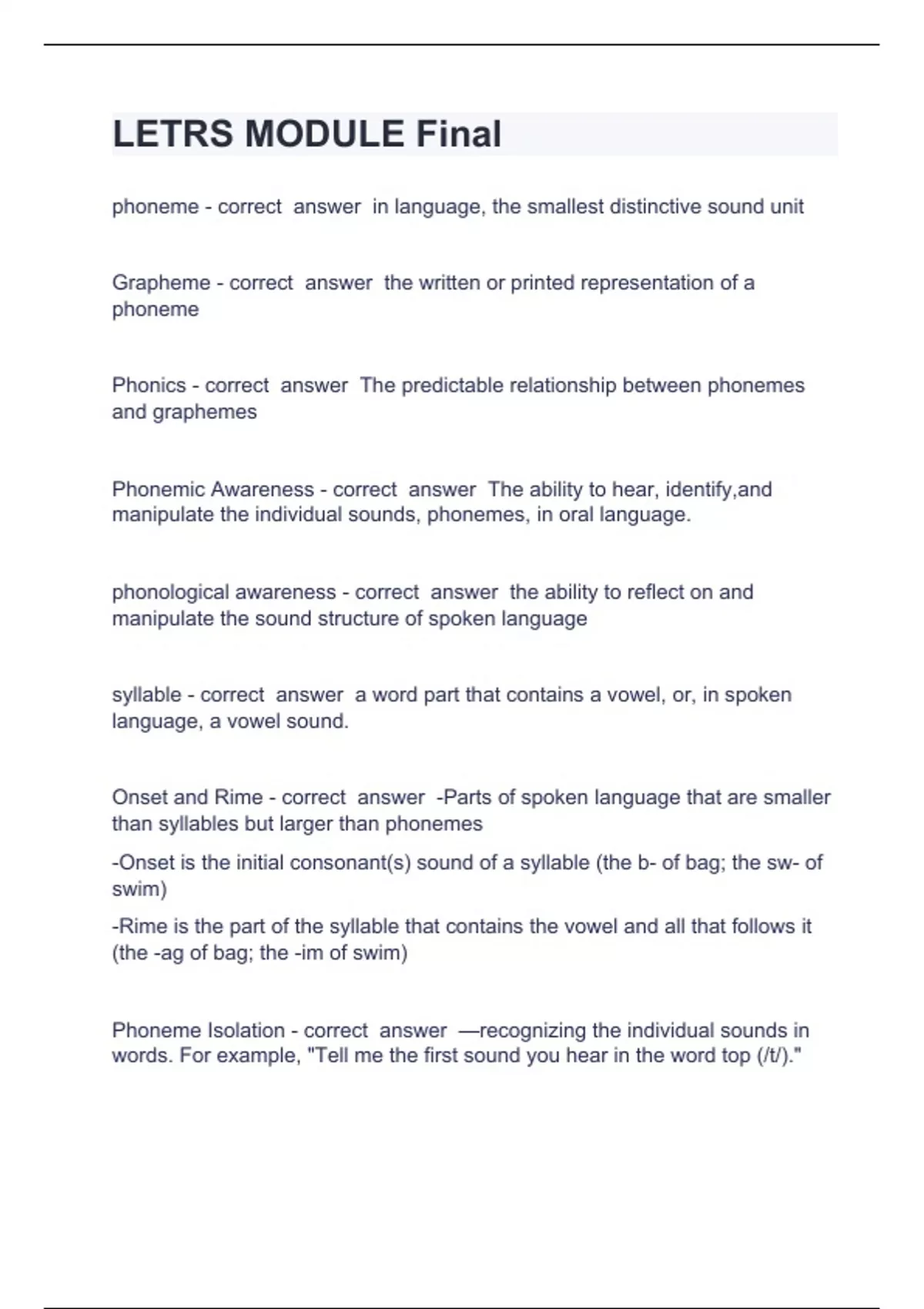 LETRS MODULE Final Question and answers already passed 2023/2024phoneme - correct answer in language, the smallest distinctive sound unit Grapheme - correct answer the written or printed representation of a phoneme Phonics - correct answer The predictable relationship between phonemes and graphemes Phonemic Awareness - correct answer The ability to hear, identify,and manipulate the individual sounds, phonemes, in oral language. phonological awareness - correct answer the ability to reflect on and manipulate the sound structure of spoken language syllable - correct answer a word part that contains a vowel, or, in spoken language, a vowel s