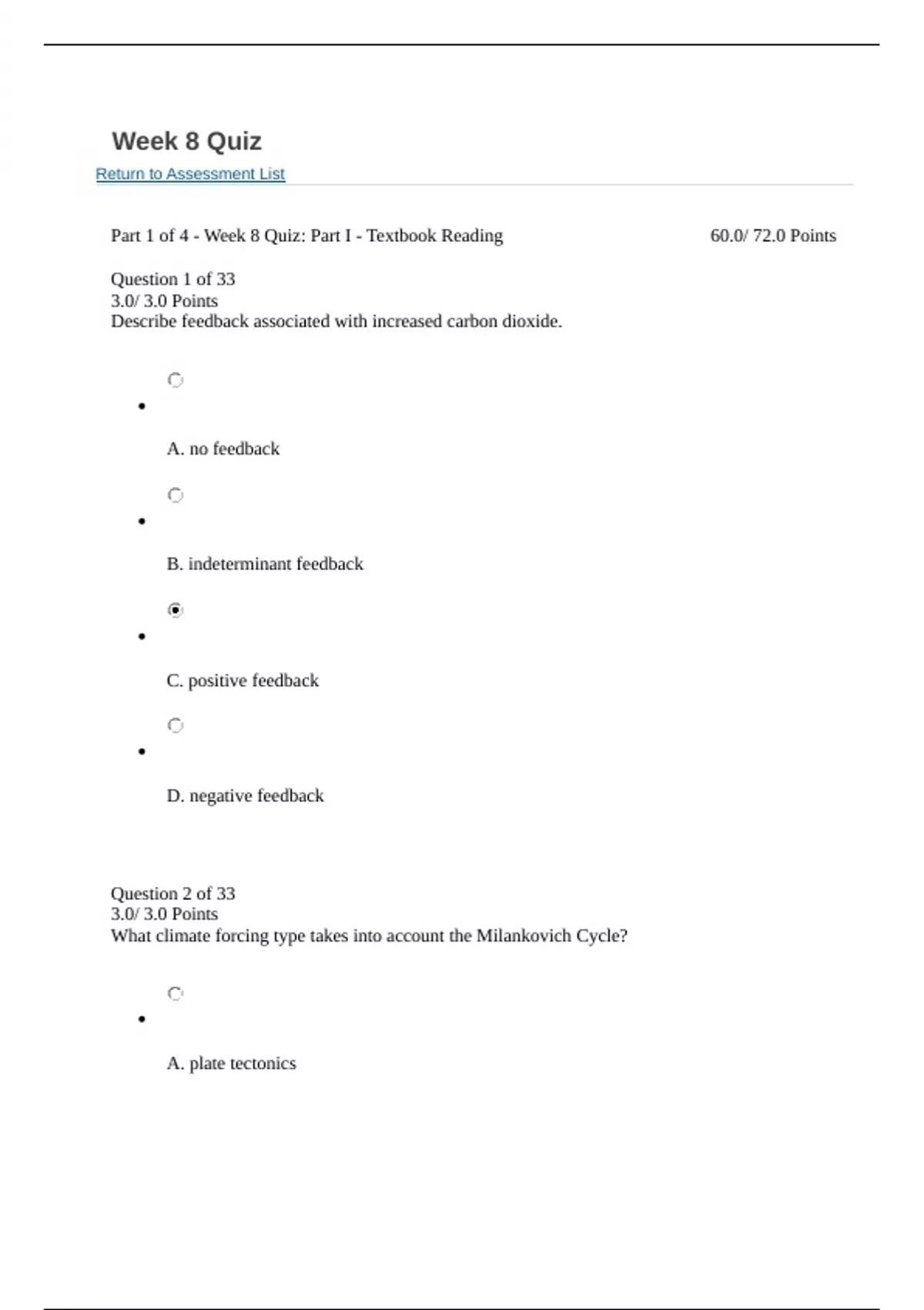 Week 8 Quiz Return to Assessment List Part 1 of 4 - Week 8 Quiz: Part I - Textbook Reading 60.0/ 72.0 Points Question 1 of 33 3.0/ 3.0 Points Describe feedback associated with increased carbon dioxide. A. no feedback B. indeterminant feedback C. positive feedback D. negative feedback Question 2 of 33 3.0/ 3.0 Points What climate forcing type takes into account the Milankovich Cycle? A. plate tectonics