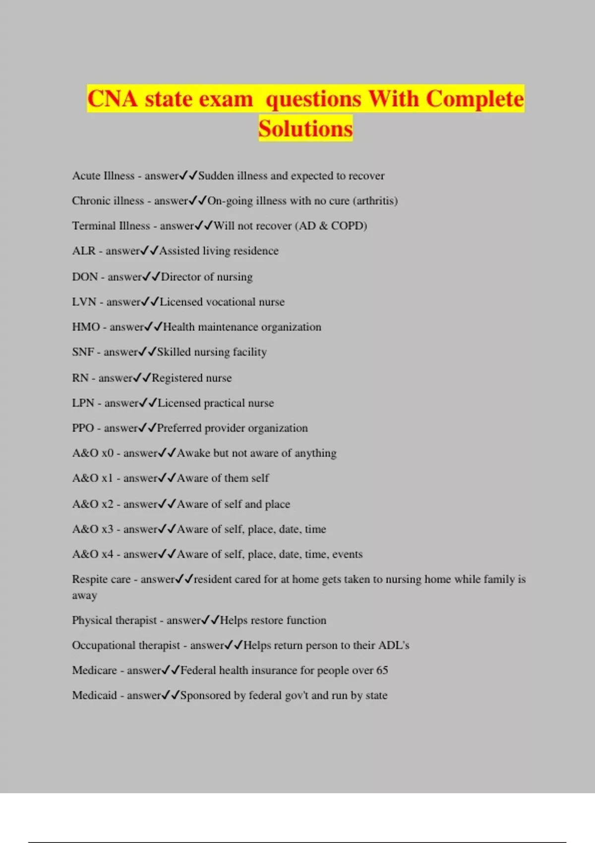CNA state exam questions With Complete Solutions Acute Illness - answerSudden illness and expected to recover Chronic illness - answerOn-going illness with no cure (arthritis) Terminal Illness - answerWill not recover (AD & COPD) ALR - answerAssisted living residence DON - answerDirector of nursing LVN - answerLicensed vocational nurse HMO - answerHealth maintenance organization SNF - answerSkilled nursing facility RN - answerRegistered nurse LPN - answerLicensed practical nurse PPO - answerPreferred provider organization A&O x0 - answerAwake but not aware of anything A&O x1 - answerAware of them self A&O x2 - answerAware of self and place A&O x3 - answerAware of self, place, date, time A&O x4 - answerAware of self, place, date, time, events Respite care - answerresident cared for at home gets taken to nursing home while family is away Physical therapist - answerHelps restore function Occupational therapist - answerHelps return person to their ADL's Medicare - answerFederal health insurance for people over 65 Medicaid - answerSponsored by federal gov't and run by state OBRA - answerOmnibus reconciliation act of 1987 residents informed of their rights orally or written Representative - answerAble to act on persons behalf if he/she cannot do so Ombudsman - answerHelps residents voice a grievance Who are restraints ordered by - answerDoctor Aiding and Abetting - answerPerson is not present during crime but has knowledge of the crime Ethics - answerKnowledge of right and wrong Libel - answerMaking false statements in writing Malpractice - answerNegligence by professional person (NOT CNA) Neglect - answerFailure to provide person with service to prevent mental/physical harm Negligence - answerUnintentional wrong where person did not act in a reasonable manner and the persons property was harmed Slander - answerMaking a false statement orally Defamation - answerInjuring persons reputation by making false statements False imprisonment - answerUnlaw