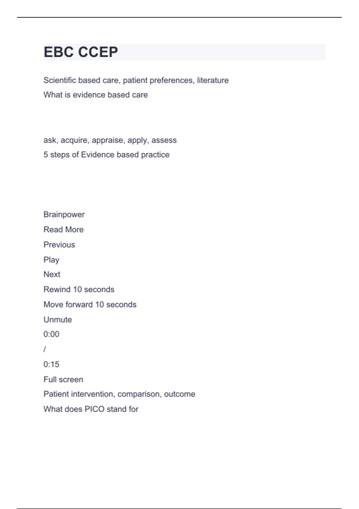 EBC CCEP Question and answers already passed 2023/2024Scientific based care, patient preferences, literature What is evidence based care ask, acquire, appraise, apply, assess 5 steps of Evidence based practice Brainpower
