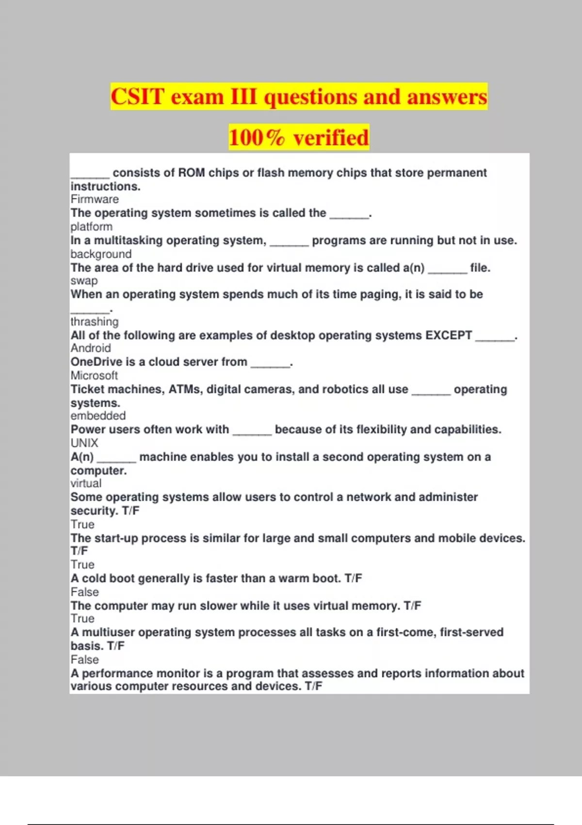 CSIT exam III questions and answers 100% verified ______ consists of ROM chips or flash memory chips that store permanent instructions. Firmware The operating system sometimes is called the ______. platform In a multitasking operating system, ______ programs are running but not in use. background The area of the hard drive used for virtual memory is called a(n) ______ file. swap When an operating system spends much of its time paging, it is said to be ______. thrashing All of the following are examples of desktop operating systems EXCEPT ______. Android OneDrive is a cloud server from ______. Microsoft Ticket machines, ATMs, digital cameras, and robotics all use ______ operating systems. embedded Power users often work with ______ because of its flexibility and capabilities. UNIX A(n) ______ machine enables you to install a second operating system on a computer. virtual Some operating systems allow users to control a network and administer security. T/F True The start-up process is similar for large and small computers and mobile devices. T/F True A cold boot generally is faster than a warm boot. T/F False The computer may run slower while it uses virtual memory. T/F True A multiuser operating system processes all tasks on a first-come, first-served basis. T/F False A performance monitor is a program that assesses and reports information about various computer resources and devices. T/F True Experts recommend that you run multiple antivirus programs simultaneously. T/F False The term, PC, sometimes is used to describe a computer that runs on a Mac operating system. T/F False Linux is a proprietary software. T/F False. Open source software - go in and make changes. Virtualization is the practice of sharing or