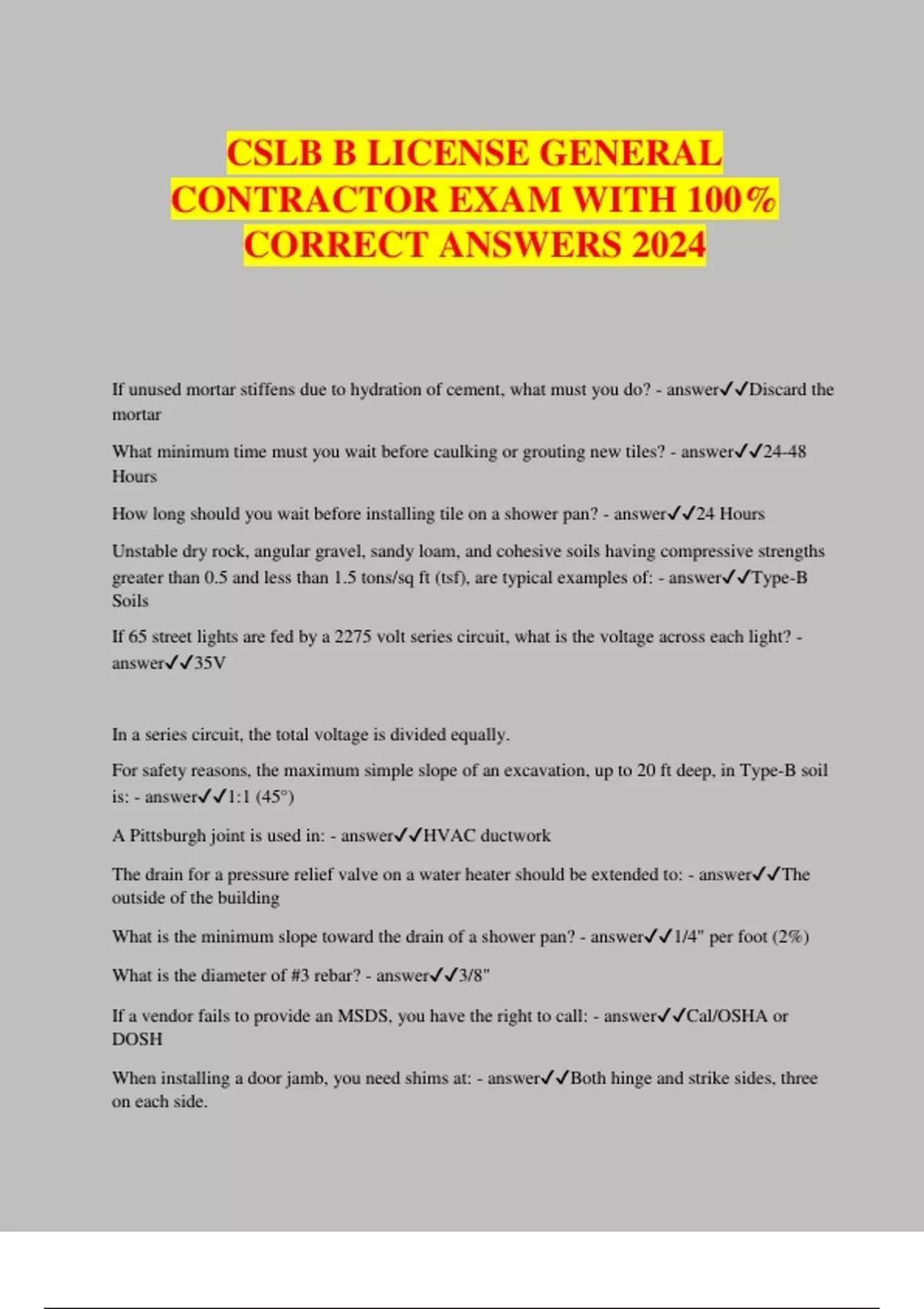 CSLB B LICENSE GENERAL CONTRACTOR EXAM WITH 100% CORRECT ANSWERS 2024 If unused mortar stiffens due to hydration of cement, what must you do? - answerDiscard the mortar What minimum time must you wait before caulking or grouting new tiles? - answer24-48 Hours How long should you wait before installing tile on a shower pan? - answer24 Hours Unstable dry rock, angular gravel, sandy loam, and cohesive soils having compressive strengths greater than 0.5 and less than 1.5 tons/sq ft (tsf), are typical examples of: - answerType-B Soils If 65 street lights are fed by a 2275 volt series circuit, what is the voltage across each light? - answer35V In a series circuit, the total voltage is divided equally. For safety reasons, the maximum simple slope of an excavation, up to 20 ft deep, in Type-B soil is: - answer1:1 (45°) A Pittsburgh joint is used in: - answerHVAC ductwork The drain for a pressure relief valve on a water heater should be extended to: - answerThe outside of the building What is the minimum slope toward the drain of a shower pan? - answer1/4" per foot (2%) What is the diameter of #3 rebar? - answer3/8" If a vendor fails to provide an MSDS, you have the right to call: - answerCal/OSHA or DOSH When installing a door jamb, you need shims at: - answerBoth hinge and strike sides, three on each side. Which of the following is used to adhere vinyl floors? A. Epoxy cement B. Asphalt mastic C. Latex primer D. White glue - answerEpoxy cement When do you need bracing for a drywall wall? - answerDiagonal bracing is needed every 25' for any drywall wall. How should you clear the roots from a construction site? - answerClear roots to 12" below grade. Dividing watts by amps gives you: - answerVolts The most frequent on-the-job roofing accidents are: - answerFalls Which of the following is NOT a type of wood block flooring? A. Parquet B. Wood Mosaic C. Wood Tile D. All of the above. - answerWood tile Lightweight concrete is best used for: A. Curb and Gutter B. Second floor decking C. First floor slab on grade D. Footings - answerSecond floor decking The tool used to carry grout needed to patch a