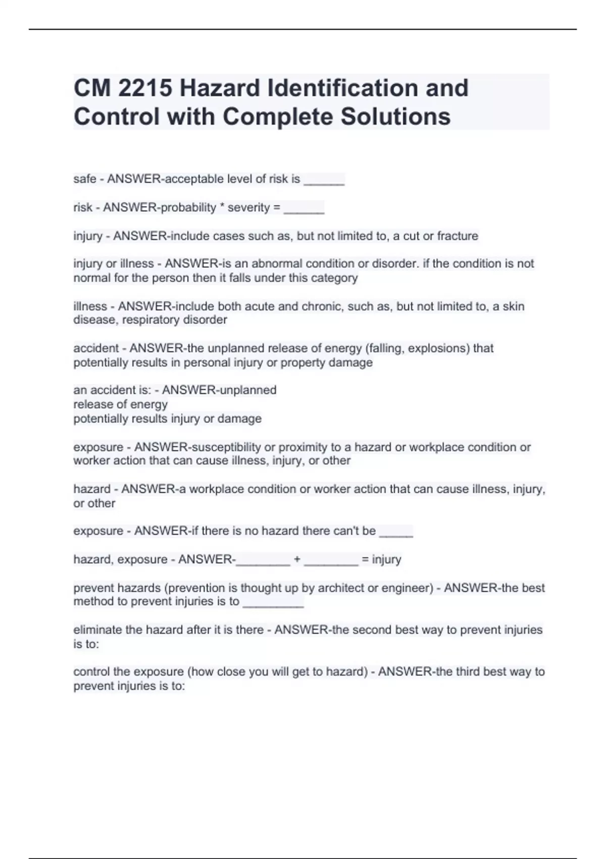 CM 2215 Hazard Identification and Control with Complete SolutionsCM 2215 Hazard Identification and Control with Complete SolutionsCM 2215 Hazard Identification and Control with Complete Solutions safe - ANSWER-acceptable level of risk is ______ risk - ANSWER-probability * severity = ______ injury - ANSWER-include cases such as, but not limited to, a cut or fracture injury or illness - ANSWER-is an abnormal condition or disorder. if the condition is not normal for the person then it falls under this category