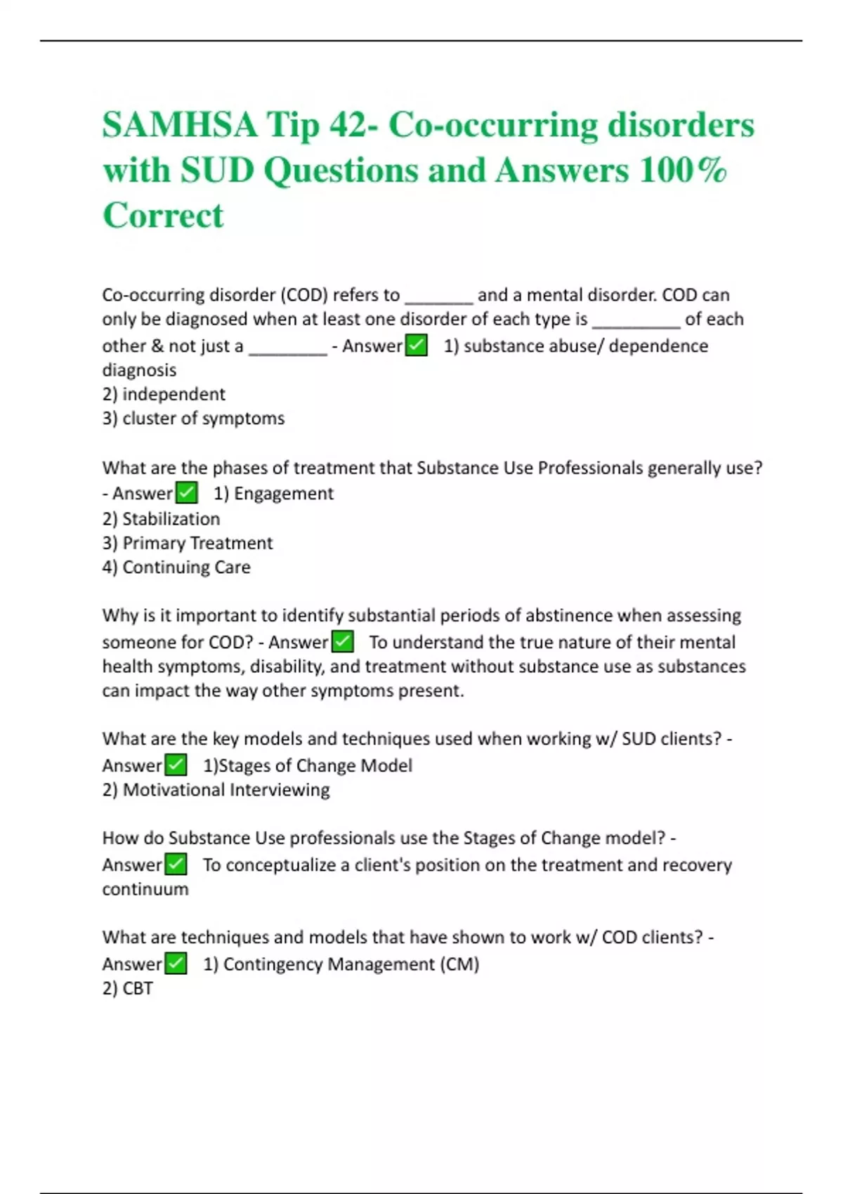 SAMHSA Tip 42- Co-occurring disorders with SUD Questions and Answers 100% Correct