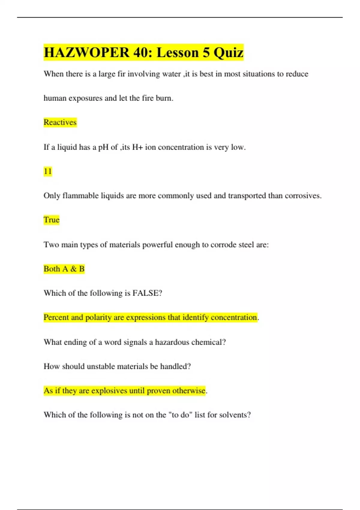 HAZWOPER 40: Lesson 5 Quiz When there is a large fir involving water ,it is best in most situations to reduce human exposures and let the fire burn. Reactives If a liquid has a pH of ,its H+ ion concentration is very low. 11 Only flammable liquids are more commonly used and transported than corrosives.