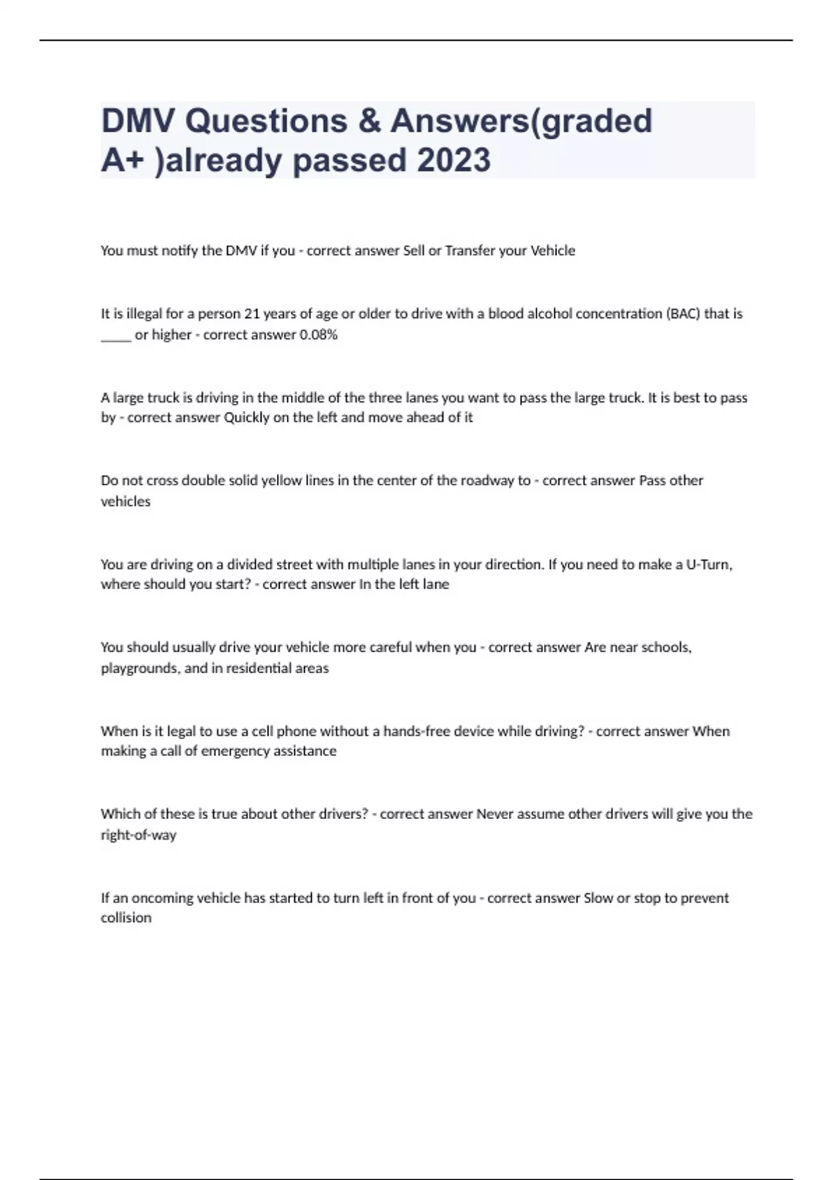 DMV Questions with complete solution 2024 You must notify the DMV if you - correct answer Sell or Transfer your Vehicle It is illegal for a person 21 years of age or older to drive with a blood alcohol concentration (BAC) that is ____ or higher - correct answer 0.08% A large truck is driving in the middle of the three lanes you want to pass the large truck. It is best to pass by - correct answer Quickly on the left and move ahead of it Do not cross double solid yellow lines in the center of the roadway to - correct answer Pass other vehicles You are driving on a divided street with multiple lanes in your direction. If you need to make a U-Turn, where should you start? - correct answer In the left lane You should usually drive your vehicle more careful when you - correct answer Are near schools, playgrounds, and in residential areas When is it legal to use a cell phone without a hands-free device while driving? - correct answer When making a call of emergency assistance Which of these is true about other drivers? - correct answer Never assume other drivers will give you the right-of-way If an oncoming vehicle has started to turn left in front of you - correct answer Slow or stop to prevent collision You are driving on a five-lan
