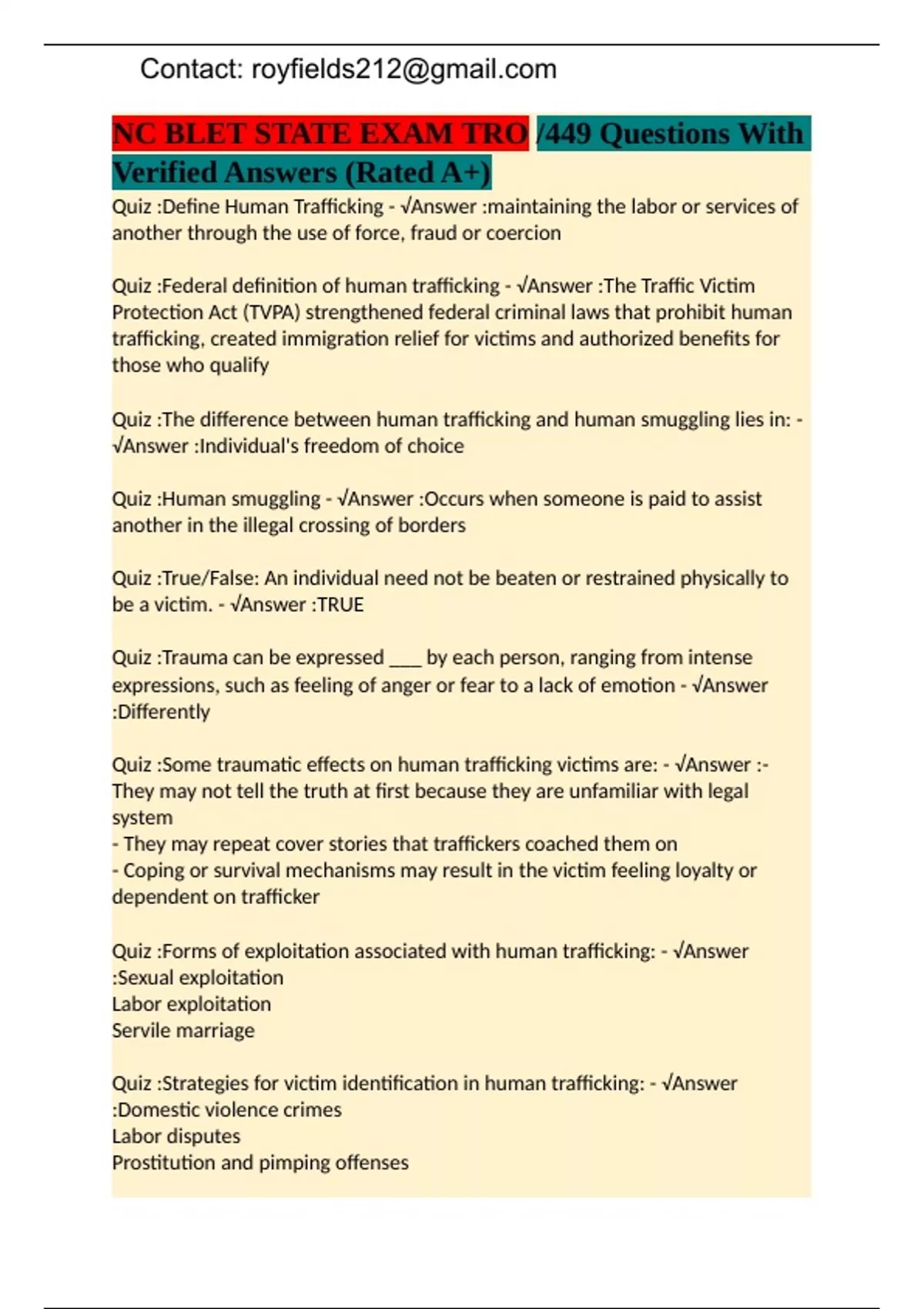 NC BLET STATE EXAM TRO /449 Questions With Verified Answers (Rated A+)