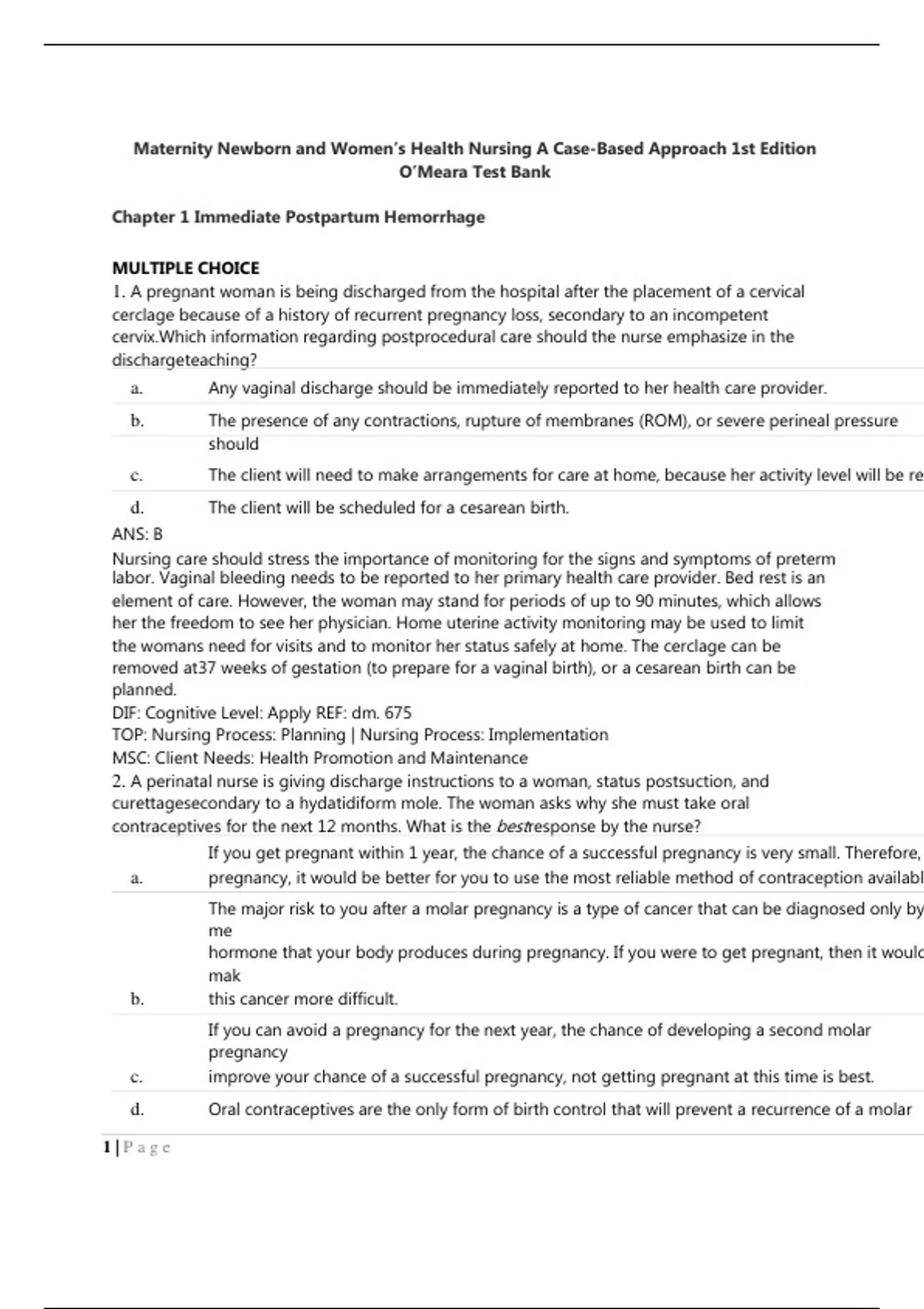 TEST BANK MATERNITY NEWBORN AND WOMEN'S HEALTH NURSING A CASE-BASED APPROACH 1ST EDITION O’MEARA