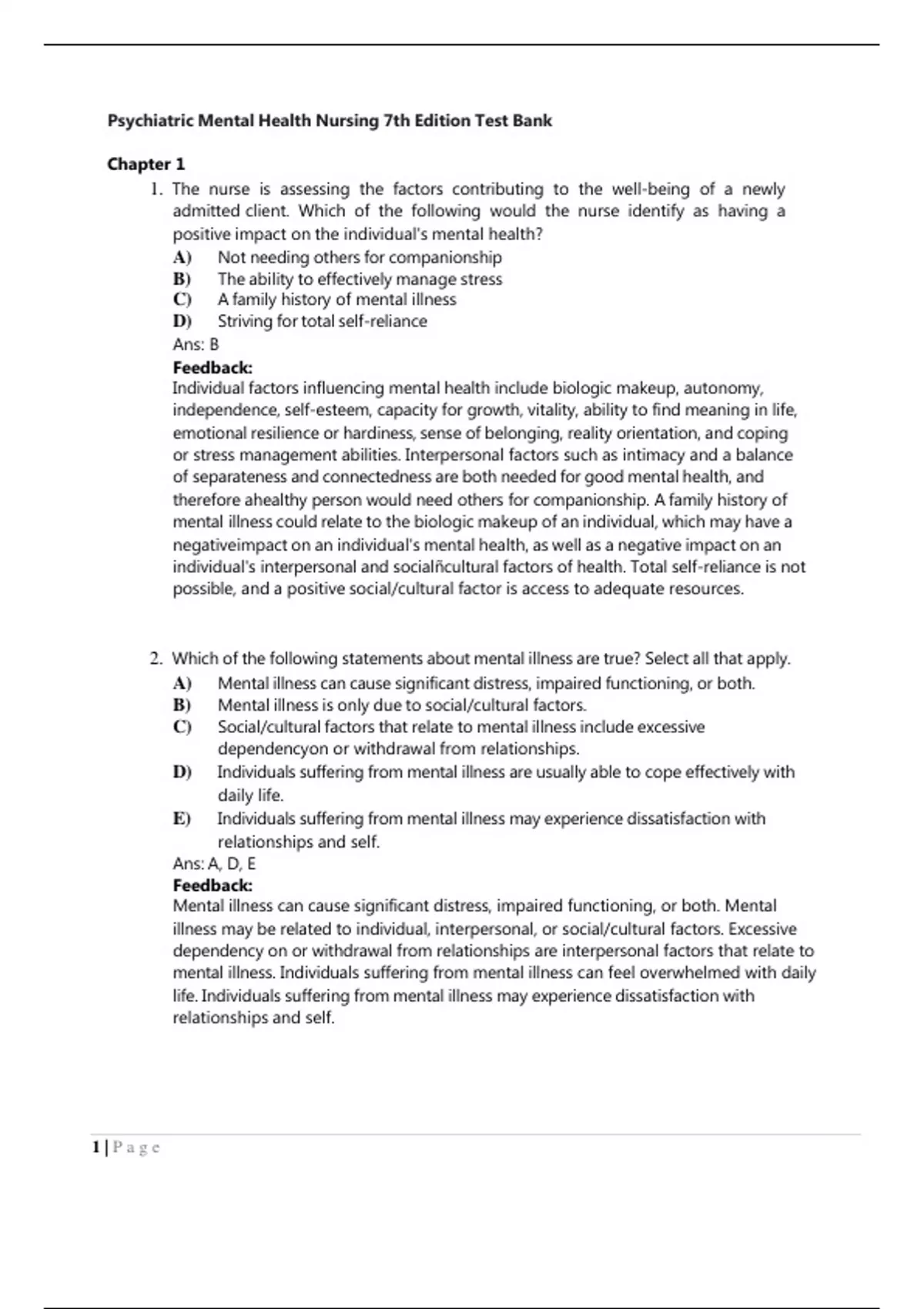 TEST BANK PSYCHIATRIC MENTAL HEALTH NURSING 7TH EDITION VIDEBECK