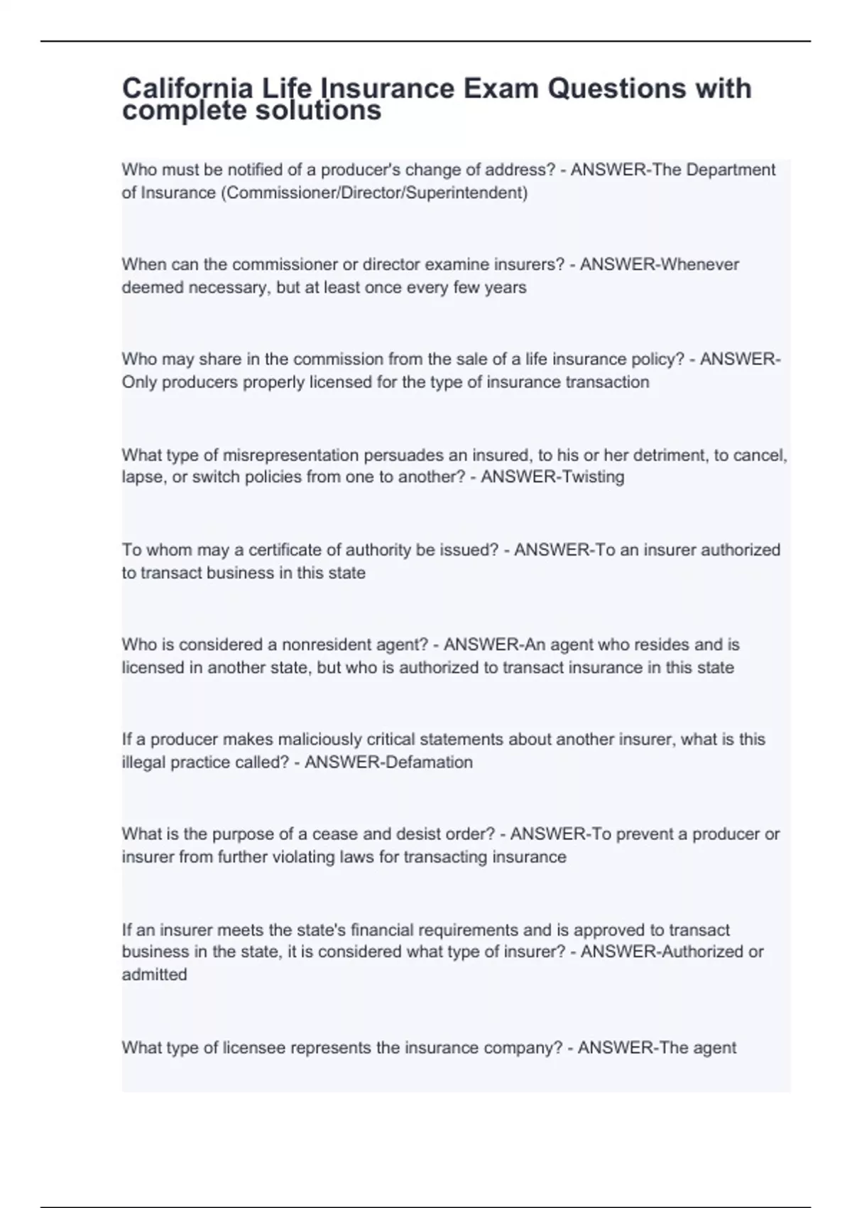 California Life Insurance Exam Questions with complete solutions