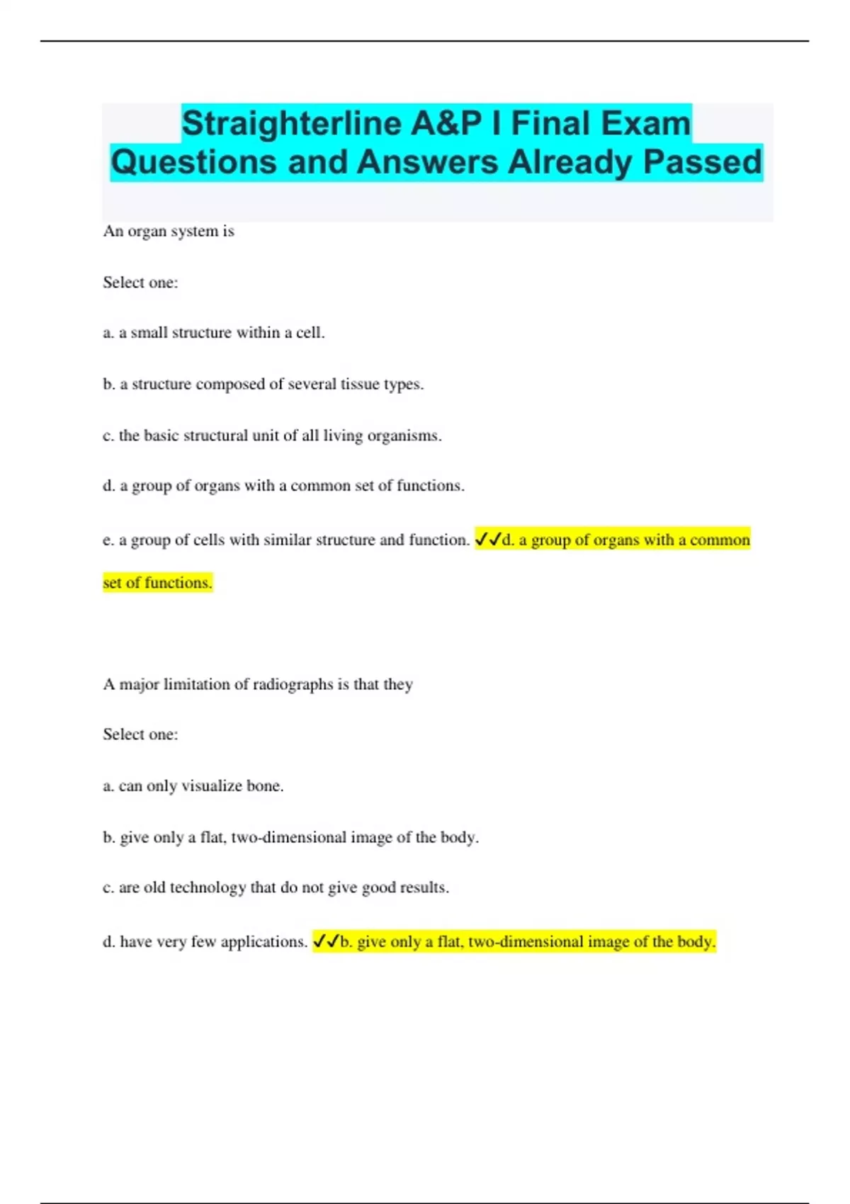 Straighterline A&P I Final Exam Questions and Answers Already Passed An organ system is Select one: a. a small structure within a cell. b. a structure composed of several tissue types. c. the basic structural unit of all living organisms. d. a group of organs with a common set of functions. e. a group of cells with similar structure and function. d. a group of organs with a common set of functions. A major limitation of radiographs is that they Select one: a. can only visualize bone. b. give only a flat, two-dimensional image of the body. c. are old technology that do not give good results. d. have very few applications. b. give only a flat, two-dimensional image of the body. A cell is Select one: a. a small structure within a molecule. b. a structure composed of several tissue types. c. the basic structural unit of living organisms. d. a group of organs with a common set of functions. e. a group of atoms with similar structure and function. c. the basic structural unit of living organisms. An organ is Select one: a. a small structure within a cell. b. a structure composed of several tissue types. c. the basic structural unit of all living organisms. d. a group of molecules with a common set of functions. e. a group of cells with similar structure and function. b. a structure composed of several tissue types. The study of the structural features and functions of the cell is Select one: a. cytology. b. histology. c. molecular biology. d. microbiology. e. surface anatomy. a. cytology. What technique creates a three-dimensional dynamic image of blood vessels? Select one: a. digital subtraction angiography b. magnetic resonance imaging c. dynamic spatial reconstruction d. positron emission tomography a. digital subtraction angiography Which subdivision of anatomy involves the study of organs that function together? Select one: a. regional b. developmental c. systemic d. histology e. surface anatomy c. systemic An organelle is Select one: a. a small structure within a cell. b. a structure composed of several tissue types. c. the basic structural unit of all living organisms. d. a group of organs with a common set of functions. e. a group of cells with similar structure and function. a. a small structure within a cell. Microscopic examination of a frozen tissue specimen is an application of which of the following disciplines? Select one: a. histology b. physiology c. gross anatomy d. radiology e. regional anatomy a. histology Anatomy is Select one: a. the study of function. b. a branch of physiology. c. the study of structure. d. the study of living organisms. e. the study of homeostasis. c. the study of structure. A molecular biologist discovers that if a specific drug effectively treats obesity in mice, what can researchers conclude? Select one: a. If the drug was effective in a large number of mice, it will therefore be effective in humans. b. If the drug was effective in a small proportion of mice, it will be effective in a small proportion of humans. c. The mice have provided a positive control in this experiment that proves the drug is effective in humans. d. The drug is effective in the mouse model; it must still be tested in humans. e. The effect of the drug on mice has no bearing