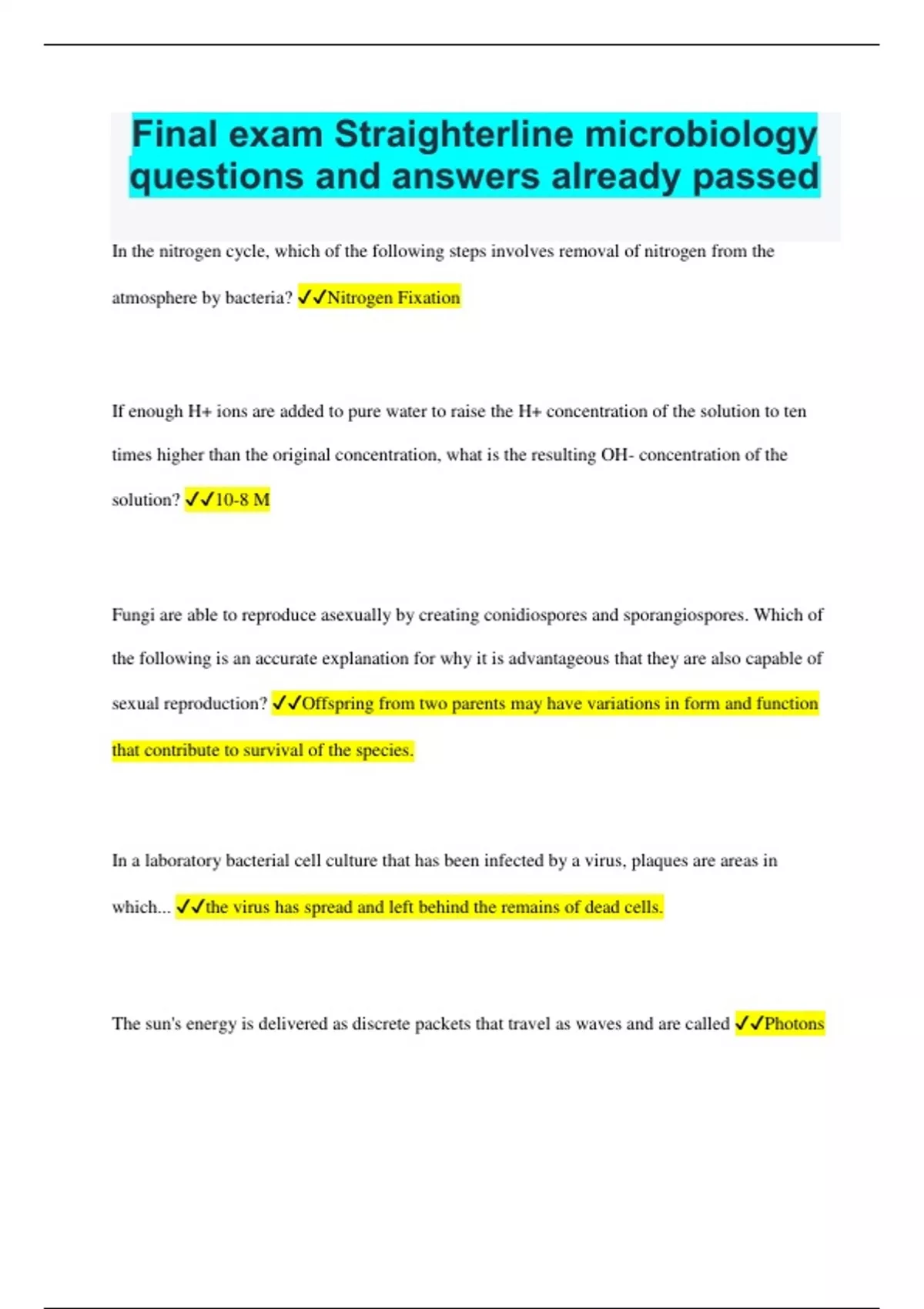 Final exam Straighterline microbiology questions and answers already passed