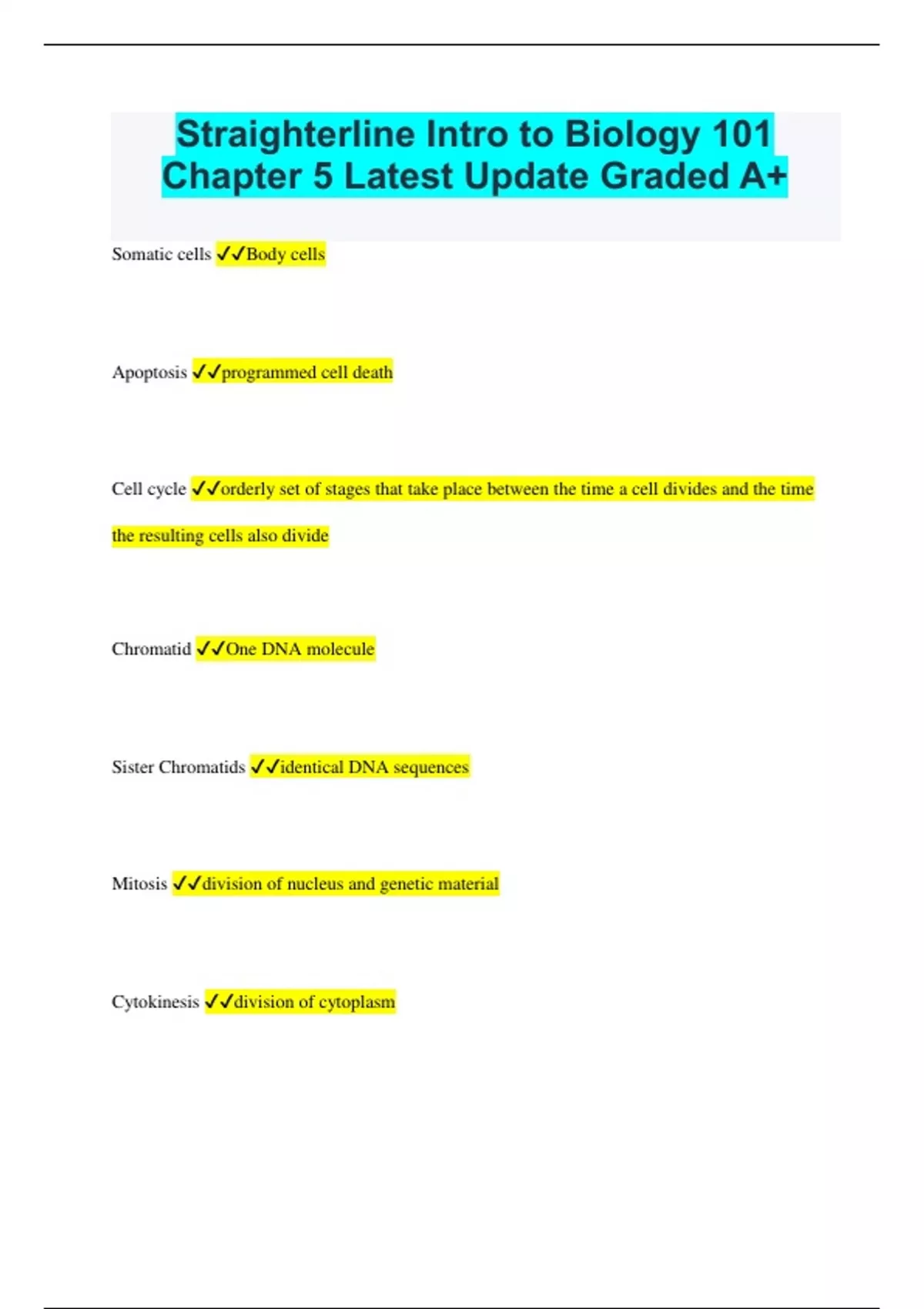 Straighterline Intro to Biology 101 Chapter 5 Latest Update Graded A+ Somatic cells Body cells Apoptosis programmed cell death Cell cycle orderly set of stages that take place between the time a cell divides and the time the resulting cells also divide Chromatid One DNA molecule Sister Chromatids identical DNA sequences Mitosis division of nucleus and genetic material Cytokinesis division of cytoplasm Caspases enzymes that bring about apoptosis Proto-oncogenes encodes proteins that promote cell cycle and prevent apoptosis Oncogenes Cancer causing gene formed by a mutation in a proto-oncogene, codes for a protein that overstimulates the cell cycle Chromatin Network of DNA strands and associated proteins observed within a nucleus of a cell. Diploid (2n) two of each type of chromosome is present Haploid (n) one of each type of chromosome is present Centromere constriction where sister chromatids of a chromosome are held together Daughter Chromosome structures produced by the separation of the sister chromatids Spindle Collection of microtubules that assist in the orderly distribution of chromosomes during cell division Prophase First phase of mitosis; characterized by the condensation of the chromatin; chromosomes are visible, but scattered in the nucleus Prometaphase Second phase of mitosis; characterized by the attachment of spindle fibers to kinetochores of each sister chromatid Metaphase Third phase of mitosis; chromosomes are aligned at the metaphase plate Anaphase Fourth phase of mitosis; chromosomes move toward the poles of the spindle Telophase Final phase of mitosis; daughter cells are located at each pole Cytokinesis cytoplasmic cleavage Cleavage furrow an indentation of the membrane between the two daughter nuclei Homologous chromosome Member of a pair of chromosomes that are alike and come together in synapsis during prophase of the first meiotic division; a homologue Synapsis Pairing of homologous chromosomes during meiosis I Gametes sex cells - sperm and egg Fertilization Fusion of sperm and egg nuclei, producing a zygote that develops into a new individual Crossing-over Exchange of segments between nonsister chromatids of a bivalent during meiosis Independent Assortment Alleles of unlinked genes segregate independently of each other during meiosis so that the gametes can contain all possible combinations of alleles Interkinesis period of time between Meiosis I and Meiosis II Spermatogenesis Production of sperm in males by the process of meiosis and maturation Oogenesis Production of eggs in females by the process