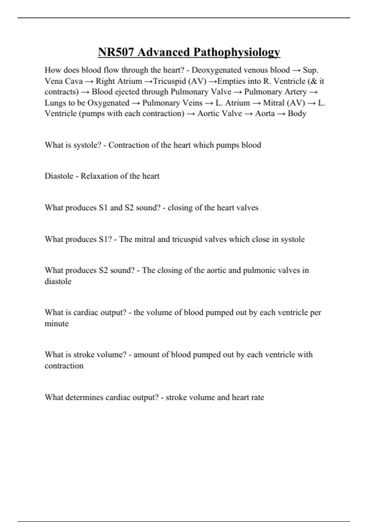 How does blood flow through the heart? - Deoxygenated venous blood → Sup. Vena Cava → Right Atrium →Tricuspid (AV) →Empties into R. Ventricle (& it contracts) → Blood ejected through Pulmonary Valve → Pulmonary Artery → Lungs to be Oxygenated → Pulmonary Veins → L. Atrium → Mitral (AV) → L. Ventricle (pumps with each contraction) → Aortic Valve → Aorta → Body What is systole? - Contraction of the heart which pumps blood Diastole - Relaxation of the heart What produces S1 and S2 sound? - closing of the heart valves What produces S1? - The mitral and tricuspid valves which close in systole What produces S2 sound? - The closing of the aortic and pulmonic valves in diastole What is cardiac output? - the volume of blood pumped out by each ventricle per minute What is stroke volume? - amount of blood pumped out by each ventricle with contraction What determines cardiac output? - stroke volume and heart rate What is preload? - the degree of stretch on the heart before it contracts, related to ventricular filling, end diastolic pressure, amount of blood entering the ventricle during diastole What is afterload? - resistance left ventricle must overcome to circulate blood What is contractility? - Normal ability of muscle to contract at a given force for a given stretch. It is independent of preload/afterload Will sustained tachycardia result in increased or decreased stroke volume? - Decreased What conditions can result in decreased contractility? - Ischemia, acidosis, cardiomyopathy What can cause increase afterload? - HTN, pulmonary disease, damage to the aortic valve What has the most immediate effect on afterload? - HTN Why would hemorrhaging cause decreased afterload? - Decreased volume of blood creates less resistance What does increased preload do to stroke volume? - Increases stroke volume, over time the body will be unable to compensate however What can cause a decreased preload? - Hemorrhage, dehydration...anything that causes reduced blood volume