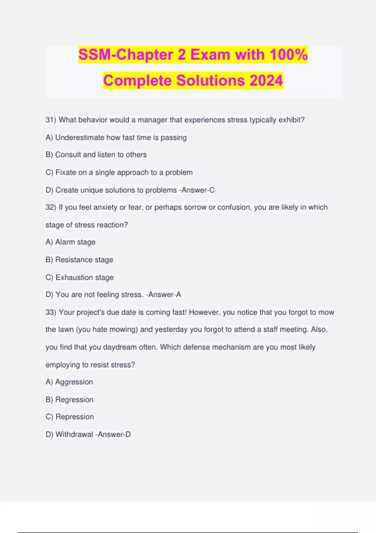 SSM-Chapter 2 Exam with 100% Complete Solutions 2024 31) What behavior would a manager that experiences stress typically exhibit? A) Underestimate how fast time is passing B) Consult and listen to others C) Fixate on a single approach to a problem D) Create unique solutions to problems -Answer-C 32) If you feel anxiety or fear, or perhaps sorrow or confusion, you are likely in which stage of stress reaction? A) Alarm stage B) Resistance stage C) Exhaustion stage D) You are not feeling stress. -Answer-A 33) Your project's due date is coming fast! However, you notice that you forgot to mow the lawn (you hate mowing) and yesterday you forgot to attend a staff meeting. Also, you find that you daydream often. Which defense mechanism are you most likely employing to resist stress? A) Aggression B) Regression C) Repression D) Withdrawal -Answer-D 34) Your flight has just been canceled. Tom is arguing with airline officials, Mary is crying, and you have decided to grab a bite to eat. Which defense mechanism is each person using? A) Tom fixation; Mary withdrawal; you repression B) Tom fixation; Mary repression; you withdrawal C) Tom aggression; Mary aggression; you fixation D) Tom aggression; Mary regression; you withdrawal -Answer-D 35) You have been worrying about your presentation to the class for weeks. However, today, it doesn't seem like it will be that bad. What is there to be worried about, they're just my friends, you say to yourself. Which defense mechanism are you most likely employing? A) Alarm B) Withdrawal C) Fixation D) Repression -Answer-D 36) Which is the best description of a person who is a "hot reactor"? A) Becomes "hot"; that is, he or she responds well to stress B) Reacts poorly to "repressors" C) Reacts poorly to stress D) Reacts negatively to certain defense mechanisms used by others -Answer-C 37) To relieve stress, you have been told to not bottle up your anger but to let it out. A teakettle will explode if you don't let the steam out. This advice coincides with which coping strategy? A) Enactive strategy B) Proactive strategy C) Reactive strategy D) Resistance strategy -Answer-C 38) Eliminating or minimizing stress by changing jobs would relate most to which type of strategy for coping with stress? A) Inactive strategy B) Proactive strategy C) Reactive strategy D) Enactive strategy -Answer-D 39) Isabel felt overwhelmed by the pressure of her pending deadline. She decided to "check out" for a few minutes and think about her upcoming ski trip to take her mind of her stress. Which type of stress-management strategy was Isabel pursuing? A) Enactive B) Proactive C) Reactive D) Distractive -Answer-C