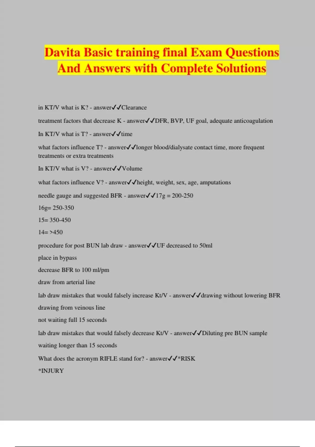 Davita Basic training final Exam Questions And Answers with Complete Solutions in KT/V what is K? - answerClearance treatment factors that decrease K - answerDFR, BVP, UF goal, adequate anticoagulation In KT/V what is T? - answertime what factors influence T? - answerlonger blood/dialysate contact time, more frequent treatments or extra treatments In KT/V what is V? - answerVolume what factors influence V? - answerheight, weight, sex, age, amputations needle gauge and suggested BFR - answer17g = 200-250 16g= 250-350 15= 350-450 14= >450 procedure for post BUN lab draw - answerUF decreased to 50ml place in bypass decrease BFR to 100 ml/pm draw from arterial line lab draw mistakes that would falsely increase Kt/V - answerdrawing without lowering BFR drawing from veinous line not waiting full 15 seconds lab draw mistakes that would falsely decrease Kt/V - answerDiluting pre BUN sample waiting longer than 15 seconds What does the acronym RIFLE stand for? - answer*RISK *INJURY *FAILURE *LOSS *END STAGE RENAL DISEASE Define AKI - answerAKI occurs when persons experience a sudden loss of kidney function. restoring function is still poss