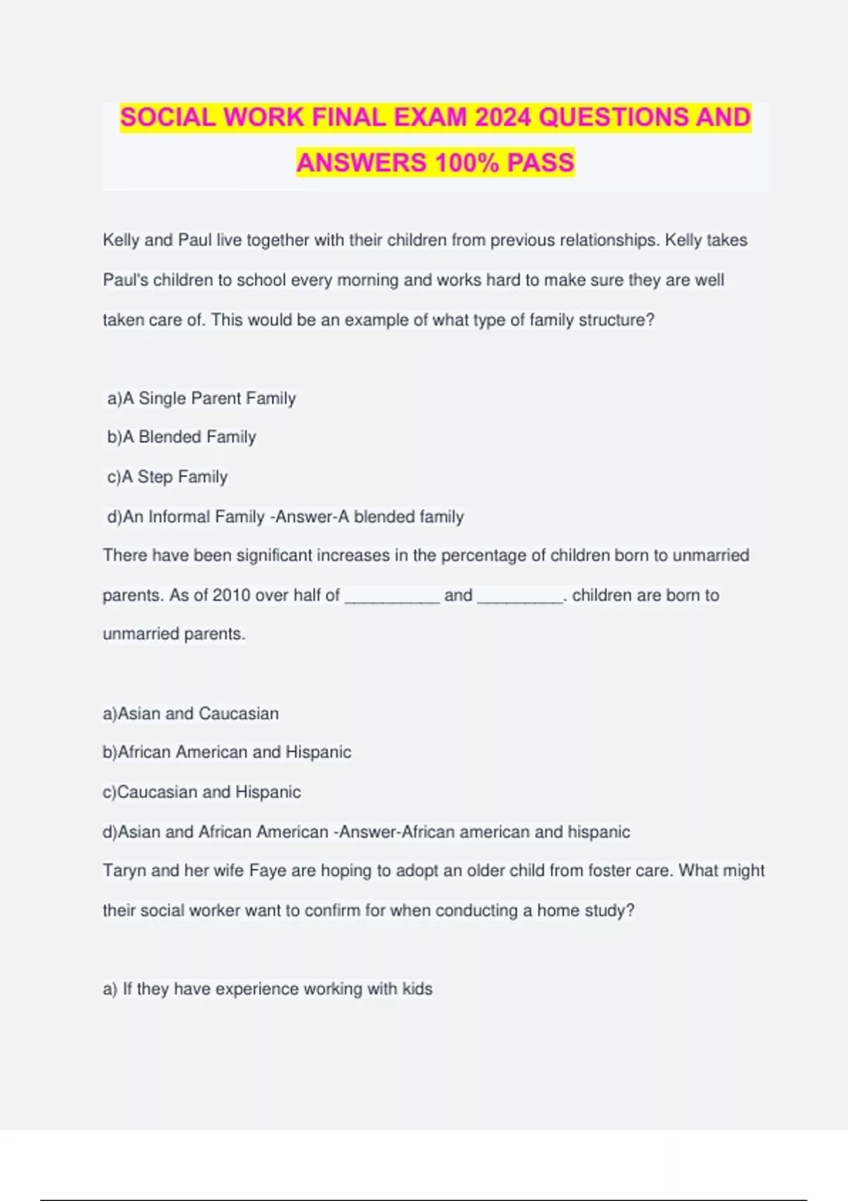 SOCIAL WORK FINAL EXAM 2024 QUESTIONS AND ANSWERS 100% PASS Kelly and Paul live together with their children from previous relationships. Kelly takes Paul's children to school every morning and works hard to make sure they are well taken care of. This would be an example of what type of family structure? a)A Single Parent Family b)A Blended Family c)A Step Family d)An Informal Family -Answer-A blended family There have been significant increases in the percentage of children born to unmarried parents. As of 2010 over half of __________ and _________. children are born to unmarried parents. a)Asian and Caucasian b)African American and Hispanic c)Caucasian and Hispanic d)Asian and African American -Answer-African american and hispanic Taryn and her wife Faye are hoping to adopt an older child from foster care. What might their social worker want to confirm for when conducting a home study? a) If they have experience working with kids b)The stability of their relationship c) Their sexual orientation d)If they are the same race as the child -Answer-The stability of their relationship In the film Juno the title character gives her baby up for adoption. She finds the couple she wants to adopt in a classified ad in the newspaper and coordinates the adoption through the couples attorney. This is an example of what kind of adoption? a)Independent Adoption b)Agency Adoption c)International Adoption d)Kinship Adoption -Answer-Independent adoption The number of american adults over 65 supported by 100 adults of working age is a ratio that helps determine the viability of Social Security. This ratio of workers to Social Security recipients is often referred to as the __________ ratio. a)Compensation b)Compatibility c)Dependency D)Value -Answer-Dependency Mike's grandfather suffers from Alzheimer's disease. If Mike wants the visit with his grandfather to go well, what activity would you recommend do with his grandfather at his visit? a) Explain to his grandfather that he has been acting delusional. b)Listen to music his grandfather enjoyed in his teenage years. c)Rearrange the room so it is more organized d)Promise to take him home -Answer-Listen to music his grandfather enjoyed in his teenage years In 2010 what percentage of older persons reported some sort of disability? a)25% b)37% c)45% d)62% -Answer-37% Elizabeth Kubler-Ross revolutionized how people with terminal illnesses are cared for in America. What change did Kubler- Ross introduce? a)Dying patients should take every opportunity to extend their b)Dying patients should limit the people they divulge their diagnosis to c) Dying patients should make amends to their family members d) Dying patients should be able to determine there end of life care -Answer-Dying patients should be able to determine there end of life care Palliative care is end of life care that ________________. a)Treats pain but does not try to cure a disease. b)Involves the family in making end of life choices c)Takes medicare as it's only form of payment. d) Includes legal counseling for end of life issues -Answer-Treats pain but does not try to cure a disease The first stage of Kubler-Ross's stages of grief is______________ a) acceptance b) bargening c) denial d) anger -Answer-Denial In 2009 the major source of income for most older adults was_________ a)Government Pensions b)Residual Income c) Social Security d) Savings -Answer-Social Security Nellie Bly worked to reform mental health treatment by_____________ a) Improving training for psychiatric nurses b) Implementing the scientific method in mental health care c) Including a patients' bill of rights in informed consent forms d) Staying in an asylum and writing about it. -Answer-Staying in an asylum and writing about it Mania, characterized by pressured speech, delusions of grandeur followed by periods of depression are indications that an individual may be suffering from what disorder? a) Bipolar Disorder b) PTSD c) Schizophrenia d) Disassociation -Answer-Bipolar Disorder Which of the following is not a symptom of schizophrenia? a) Delusions of grandeur b) An individual developing multiple personalities c) Scrambling words in a strange sort of "word salad" d) Auditory hallucinations -Answer-An individual developing multiple personalities Which of the following is true of Post Traumatic Stress Disorder? a)Post Traumatic Stress Disorder is genetic and can run in families b)The DSM-5 does not categorize Post Traumatic Stres