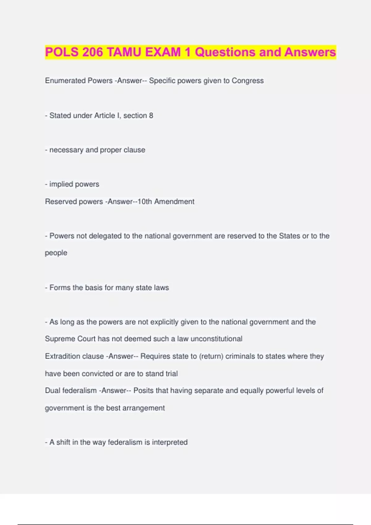 POLS 206 TAMU EXAM 1 Questions and Answers Enumerated Powers -Answer-- Specific powers given to Congress - Stated under Article I, section 8 - necessary and proper clause - implied powers Reserved powers -Answer--10th Amendment - Powers not delegated to the national government are reserved to the States or to the people - Forms the basis for many state laws - As long as the powers are not explicitly given to the national government and the Supreme Court has not deemed such a law unconstitutional Extradition clause -Answer-- Requires state to (return) criminals to states where they have been convicted or are to stand trial Dual federalism -Answer-- Posits that having separate and equally powerful levels of government is the best arrangement - A shift in the way federalism is interpreted - Layer cake Categorical grants -Answer-- Narrowly defined purposes such as federal highway grants to states for road construction - Often available on a matching basis; states must contribute some money to match some of the federal funds - Money given to states can alter their policy objectives Missouri Compromise 1820 -Answer-- → 1st major legislative compromise → Settle the slavery issue by drawing a line between state & free territory - NO slavery above 36°30' latitude like (except (state) Concurrent powers -Answer-- Those shared by the federal and state governments Examples of concurrent Powers -Answer--Power to tax -Right to borrow money -Can establish courts -Charter banks -Spend money for the general welfare Supremacy Clause -Answer-- Stating that all laws made furthering the Constitution and all treaties made under the authority of the U.S. are "supreme law of the land" Full faith and credit clause -Answer-- Requiring each state to recognize the official documents and civil judgements rendered by the courts of other states - ex: driver's license Cooperative federalism -Answer-- needed because of great depression - state and local governments are like federal field agents - The intertwined relationship between national, state, and local government that began with the New Deal (marble cake federalism) - needed because of great depression - new deal programs - Programs developed at federal level but administered by state Block grants -Answer-- For board purposes; consolidate many categorical grants into fewer, less restrictive grants - Ex. maintaining health or promoting education Kansas-Nebraska Act 1854 -Answer-- Two states became slave states → Allowing future settlers in territories to decide slave/free state - repealed Missouri compromise - Congress delayed Kansas' entry into the union until 1861 Bill of attainder -Answer-- A law declaring an act illegal without providing a judicial trial Ex post facto law -Answer-- Laws that criminalize an act even if it was legal when committed - Increases the punishment for a crime after it was already committed - Changes the rule of evidence to make conviction easier - ex: speeding Necessary and proper clause -Answer-- Allows Congress to make all laws necessary and proper to carry out all powers the Constitution vests in the national government Nullification (nullification doctrine) -Answer-- States could invalidate federal laws deemed unconstitutional Privileges and immunities clause -Answer-- Guarantees that citizens of each state have same rights as citizens of all other states Civil liberties -Answer-- Personal guarantees and freedoms that government cannot abridge, either by law, constitution, or judicial interpretation - freedom from arbitrary and discriminatory treatment Espionage Act 1917 -Answer-- Prohibits sharing information with intent to interfere with operation or success of armed forces of U.S. or to promote the success of its enemies - Originally → prevent disclosure of classified information from an authorized person - Ex. Edward Snowden charged for leaking information → Worked for NSA Symbolic Speech -Answer-- The use of symbols, rather than words to convey ideas - Actions that convey a particular message - Men burned their draft cards during Vietnam War - Students wore black armbands to school to protest the war Libel -Answer-- False written statement that defames a chara