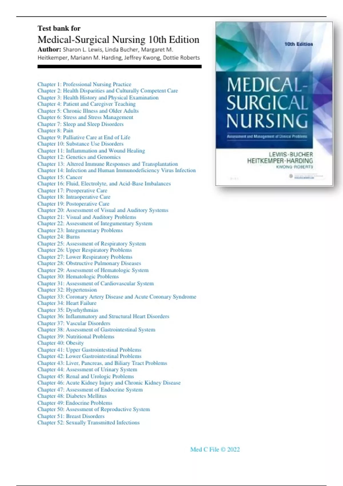 Test bank for Medical-Surgical Nursing 10th Edition By Lewis, Bucher, Heitkemper, Harding, Kwong, Roberts Chapter 1-68 | Complete Guide A+