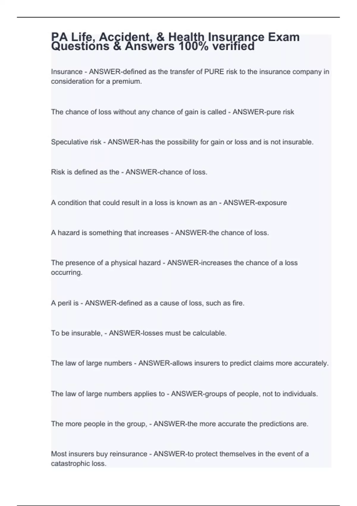 Insurance - ANSWER-defined as the transfer of PURE risk to the insurance company in consideration for a premium. The chance of loss without any chance of gain is called - ANSWER-pure risk Speculative risk - ANSWER-has the possibility for gain or loss and is not insurable. Risk is defined as the - ANSWER-chance of loss. A condition that could result in a loss is known as an - ANSWER-exposure A hazard is something that increases - ANSWER-the chance of loss. The presence of a physical hazard - ANSWER-increases the chance of a loss occurring. A peril is - ANSWER-defined as a cause of loss, such as fire. To be insurable, - ANSWER-losses must be calculable. The law of large numbers - ANSWER-allows insurers to predict claims more accurately. The law of large numbers applies to - ANSWER-groups of people, not to individuals. The more people in the group, - ANSWER-the more accurate the predictions are.