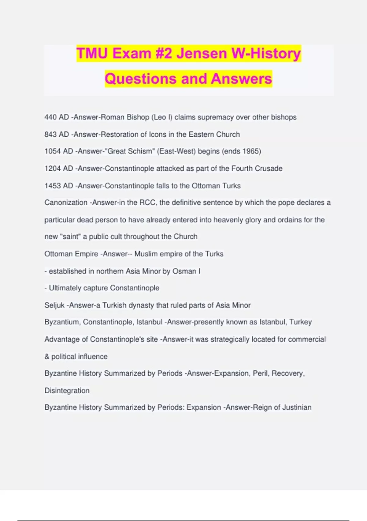 TMU Exam #2 Jensen W-History Questions and Answers 440 AD -Answer-Roman Bishop (Leo I) claims supremacy over other bishops 843 AD -Answer-Restoration of Icons in the Eastern Church 1054 AD -Answer-"Great Schism" (East-West) begins (ends 1965) 1204 AD -Answer-Constantinople attacked as part of the Fourth Crusade 1453 AD -Answer-Constantinople falls to the Ottoman Turks Canonization -Answer-in the RCC, the definitive sentence by which the pope declares a particular dead person to have already entered into heavenly glory and ordains for the new "saint" a public cult throughout the Church Ottoman Empire -Answer-- Muslim empire of the Turks - established in northern Asia Minor by Osman I - Ultimately capture Constantinople Seljuk -Answer-a Turkish dynasty that ruled parts of Asia Minor Byzantium, Constantinople, Istanbul -Answer-presently known as Istanbul, Turkey Advantage of Constantinople's site -Answer-it was strategically located for commercial & political influence Byzantine History Summarized by Periods -Answer-Expansion, Peril, Recovery, Disintegration Byzantine History Summarized by Periods: Expansion -Answer-Reign of Justinian Byzantine History Summarized by Periods: Peril -Answer-1. The iconoclastic controversy -Icons were religious images used to foster worship-flat pictures, mosaics Iconoclasts (people) -Answer-tried to destroy all icons the veneration of icons -Answer-was allowed and they remain a part of Eastern Orthodoxy Byzantine History Summarized by Periods: Recovery -Answer-Byzantium experienced a "Golden Age" Byzantine History Summarized by Periods: Disintegration -Answer-the Byzantine empire began to fall apart: lost at the Manzikert to Muslim Seljuk Turks Reasons for the Byzantine Empire's Endurance -Answer-- money economy (opposed to a barter economy) - advanced military science: Greek fire (worked like Napalm) - centralized administration - church/state link -"Caesaropapism"- enhanced unity and stability Greek or Eastern Orthodox Church -Answer-theological authority in the three main branches of Christianity Orthodox (Greek/Eastern) -Answer-the internal witness of the promised Holy Spirit keeps the truth The RCC asserts spiritual authority in: -Answer-tradition, the pope, & the Scriptures Protestantism asserts that the spiritual authority rests in: -Answer-the inerrant Word of God (sola scriptura)