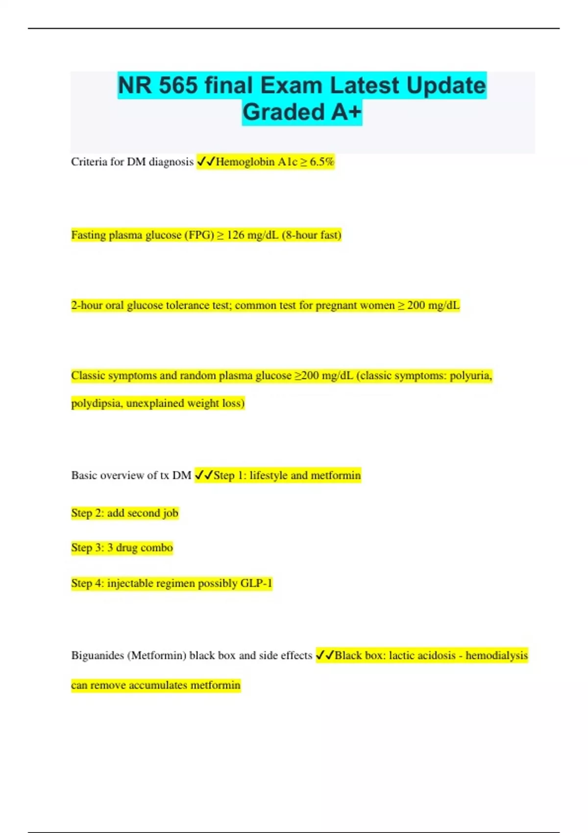 NR 565 final Exam Latest Update Graded A+ Criteria for DM diagnosis Hemoglobin A1c ≥ 6.5% Fasting plasma glucose (FPG) ≥ 126 mg/dL (8-hour fast) 2-hour oral glucose tolerance test; common test for pregnant women ≥ 200 mg/dL Classic symptoms and random plasma glucose ≥200 mg/dL (classic symptoms: polyuria, polydipsia, unexplained weight loss) Basic overview of tx DM Step 1: lifestyle and metformin Step 2: add second job Step 3: 3 drug combo Step 4: injectable regimen possibly GLP-1 Biguanides (Metformin) black box and side effects Black box: lactic acidosis - hemodialysis can remove accumulates metformin Side effects: decreased appetite, nausea, diarrhea, vit b12, folate Monitor renal function if GFR < 30 dc drug Sulfonylureas Contraindications Pregnancy Type 1DM BF Renal and hepatic dysfunction Sulfonylureas drug examples and education -"ides" Only for type 2 diabetes Educate on s/s of hypoglycemia Meglitinides Only for type 2 dm, same as sulfonylureas, stimulate pancreatic insulin release Contraindicated in liver impairment and gemfibrozil Meglitinides drugs Glinides TZDs Only type 2 Avoid in heart failure and bladder cancer TZD drugs end in -"zones" SGLT2 inhibitors end -flozin SGLT-2 contraindications If can't get to bathroom easily Caution with vulvovaginal and uti infections SGLT 2 educate S/s hypoglycemia, UTI infections or vulvovaginal infections Stay hydrated Dipeptidyl Peptidase-4 Inhibitors end Gliptin DPP-4 inhibitors MOA increase insulin production and decrease glucose production DPP-4 inhibitors contraindications Pancreatitis DPP-4 inhibitors educates S/s hypoglycemia May see weight loss GLP-1 agonists end in Tides GLP-1 agonists 4 actions Increase dullness Delay gastric emptying Increase sensitivity to insulin Cardio protective GLP-1 agonists contraindications Pregnancy Renal dysfunction/ transplant Pancreatitis If pt has personal or family hx of thyroid carcinoma Education on GLP-1 agonist Delay gastric emptying so May effect other drugs that are taken
