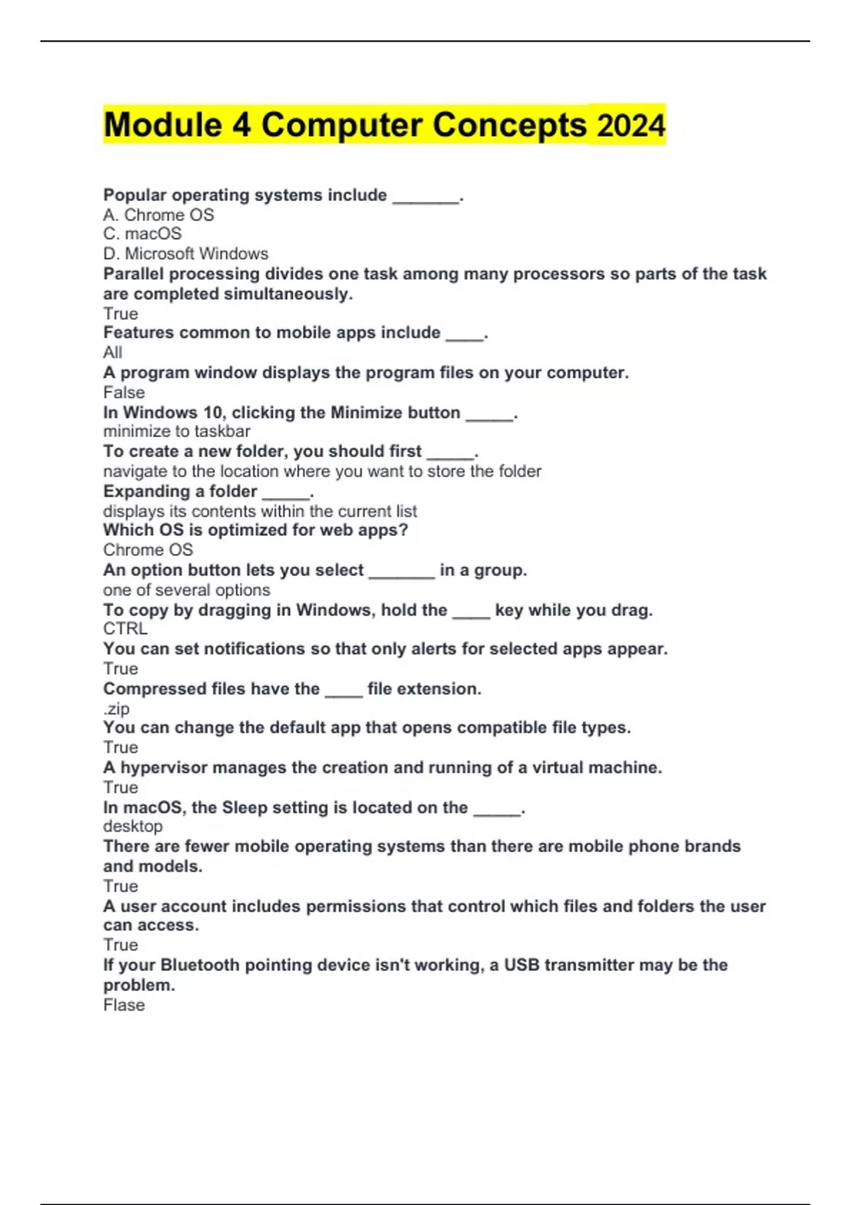 Module 4 Computer Concepts 2024 Popular operating systems include _______. A. Chrome OS C. macOS D. Microsoft Windows Parallel processing divides one task among many processors so parts of the task are completed simultaneously. True Features common to mobile apps include ____. All A program window displays the program files on your computer. False In Windows 10, clicking the Minimize button _____. minimize to taskbar To create a new folder, you should first _____. navigate to the location where you want to store the folder Expanding a folder _____. displays its contents within the current list Which OS is optimized for web apps? Chrome OS
