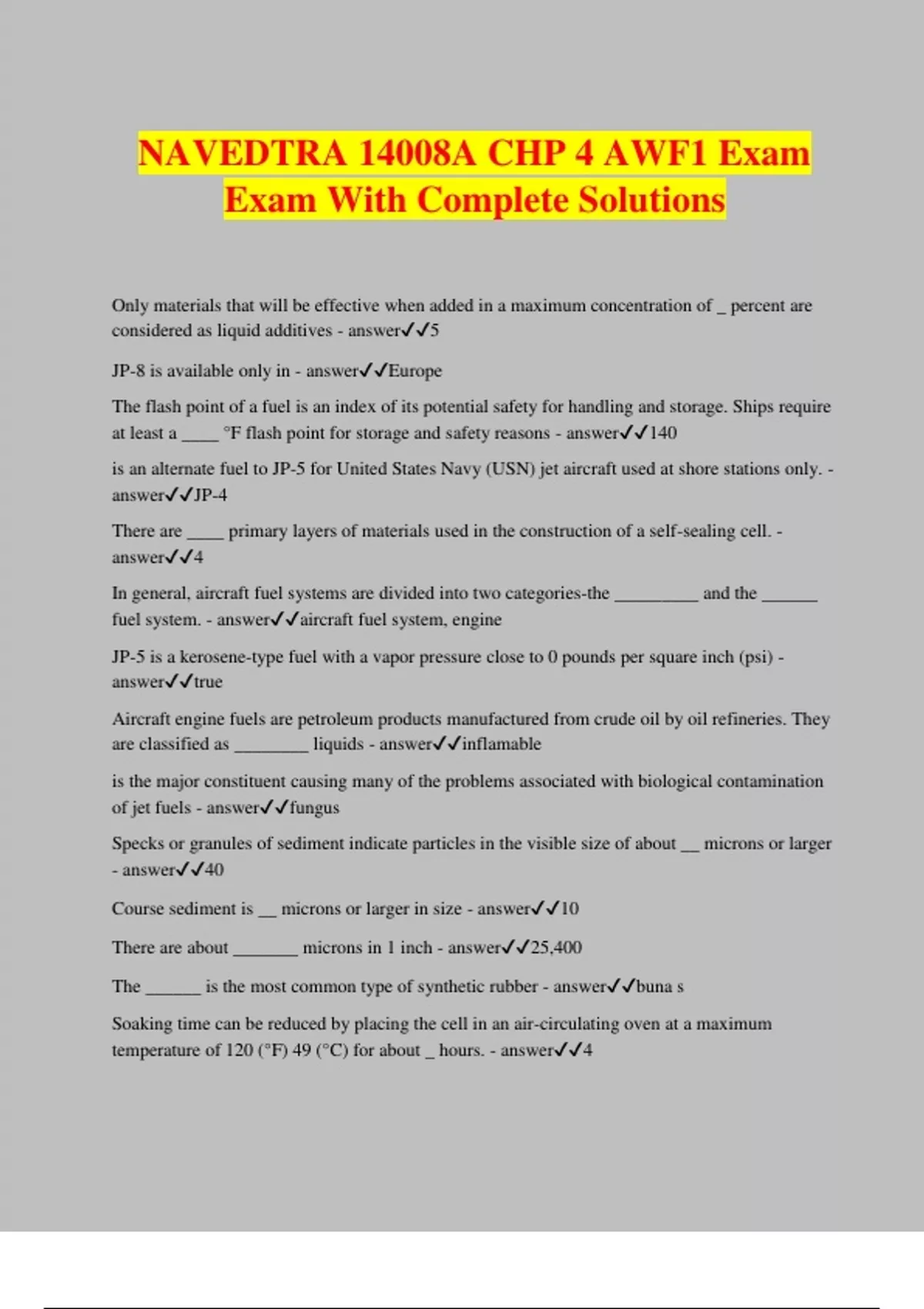 NAVEDTRA 14008A CHP 4 AWF1 Exam Exam With Complete Solutions Only materials that will be effective when added in a maximum concentration of _ percent are considered as liquid additives - answer5 JP-8 is available only in - answerEurope The flash point of a fuel is an index of its potential safety for handling and storage. Ships require at least a ____ °F flash point for storage and safety reasons - answer140 is an alternate fuel to JP-5 for United States Navy (USN) jet aircraft used at shore stations only. - answerJP-4 There are ____ primary layers of materials used in the construction of a self-sealing cell. - answer4 In general, aircraft fuel systems are divided into two categories-the _________ and the ______ fuel system. - answeraircraft fuel system, engine JP-5 is a kerosene-type fuel with a vapor pressure close to 0 pounds per square inch (psi) - answertrue