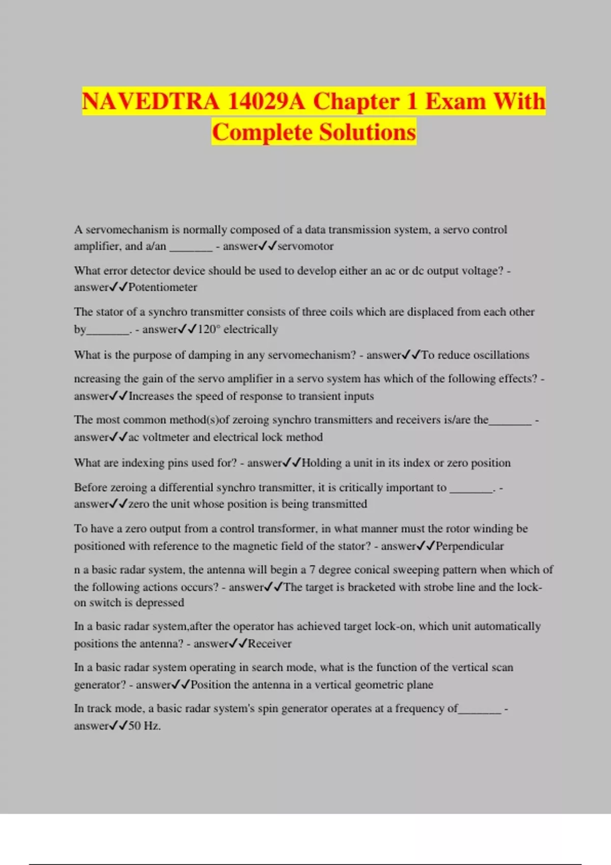 NAVEDTRA 14029A Chapter 1 Exam With Complete Solutions A servomechanism is normally composed of a data transmission system, a servo control amplifier, and a/an _______ - answerservomotor What error detector device should be used to develop either an ac or dc output voltage? - answerPotentiometer The stator of a synchro transmitter consists of three coils which are displaced from each other by_______. - answer120° electrically What is the purpose of damping in any servomechanism? - answerTo reduce oscillations ncreasing the gain of the servo amplifier in a servo system has which of the following effects? - answerIncreases the speed of response to transient inputs The most common method(s)of zeroing synchro transmitters and receivers is/are the_______ - answerac voltmeter and electrical lock method