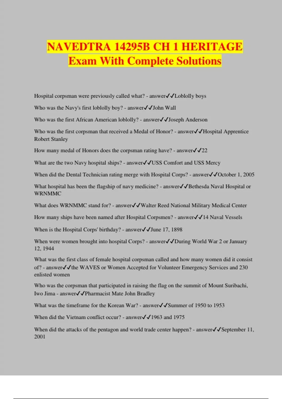 NAVEDTRA 14295B CH 1 HERITAGE Exam With Complete Solutions Hospital corpsman were previously called what? - answerLoblolly boys Who was the Navy's first loblolly boy? - answerJohn Wall Who was the first African American loblolly? - answerJoseph Anderson Who was the first corpsman that received a Medal of Honor? - answerHospital Apprentice Robert Stanley How many medal of Honors does the corpsman rating have? - answer22