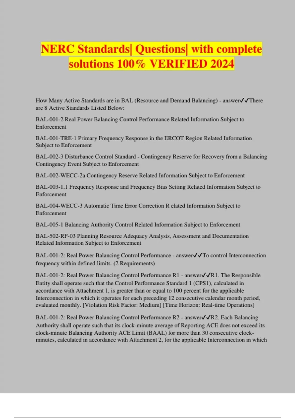 NERC Standards| Questions| with complete solutions 100% VERIFIED 2024 How Many Active Standards are in BAL (Resource and Demand Balancing) - answerThere are 8 Active Standards Listed Below: BAL-001-2 Real Power Balancing Control Performance Related Information Subject to Enforcement BAL-001-TRE-1 Primary Frequency Response in the ERCOT Region Related Information Subject to Enforcement BAL-002-3 Disturbance Control Standard - Contingency Reserve for Recovery from a Balancing Contingency Event Subject to Enforcement BAL-002-WECC-2a Contingency Reserve Related Information Subject to Enforcement BAL-003-1.1 Frequency Response and Frequency Bias Setting Related Information Subject to Enforcement BAL-004-WECC-3 Automatic Time Error Correction R elated Information Subject to Enforcement BAL-005-1 Balancing Authority Control Related Information Subject to Enforcement BAL-502-RF-03 Planning Resource Adequacy Analysis, Assessment and Documentation Related Information Subject to Enforcement BAL-001-2: Real Power Balancing Control Performance - answerTo control Interconnection frequency within defined limits. (2 Requirements) BAL-001-2: Real Power Balancing Control Performance R1 - answerR1. The Responsible Entity shall operate such that the Control Performance Standard 1 (CPS1), calculated in accordance with Attachment 1, is greater than or equal to 100 percent for the applicable Interconnection in which it operates for each preceding 12 consecutive calendar month period, evaluated monthly. [Violation Risk Factor: Medium] [Time Horizon: Real-time Operations] BAL-001-2: Real Power Balancing Control Performance R2 - answerR2. Each Balancing Authority shall operate such that its clock-minute average of Reporting ACE does not exceed its clock-minute Balancing Authority ACE Limit (BAAL) for more than 30 consecutive clock- minutes, calculated in accordance with Attachment 2, for the applicable Interconnection in which the Balancing Authority operates.[Violation Risk Factor: Medium] [Time Horizon: Real-time Operations] BAL-001-TRE-1: Primary Frequency Response in the ERCOT Region - answerTo maintain Interconnection steady-state frequency within defined limits. Contingency Reserve Restoration Period - answerA period not exceeding 90 minutes following the end of the Contingency Event Recovery Period. BAL-001-TRE-1: R1 Primary Frequency Response in the ERCOT Region - answerR2. The BA shall calculate the Primary Frequency Response of each generating unit/generating facility in accordance with this standard and the Primary Frequency Response Reference Document.1 This calculation shall provide a 12-month rolling average of initial and sustained Primary Frequency Response performance. This calculation shall be completed each month for the preceding 12 calendar months. 2.1. The performance of a combined cycle facility will be determined using an expected performance droop of 5.78%. 2.2. The calculation results shall be submitted to the Compliance Enforcement Authority and made available to the GO by the end of the month in which they were completed. 2.3. If a generating unit/generating facility has not participated in a minimum of (8) eight FMEs in a 12-month period, its performance shall be based on a rolling eight FME average response. [Violation Risk Factor = Lower] [Time Horizon = Operations Assessment] M2. The BA shall have evidence it calculated and reported the rolling average initial and sustained Primary Frequency Response performance of each generating unit/generating facility monthly as required in Requirement R2. BAL-001-TRE-1: R3 Primary Frequency Response in the ERCOT Region - answerR3. The BA shall determine the Interconnection minimum Frequency Response (IMFR) in December of each year for the following year, and make the IMFR, the methodology for calculation and the criteria for determination of the IMFR publicly available. BAL-002-3: Disturbance Control Standard - Contingency Reserve for Recovery from a Balancing Contingency Event - answerTo ensure