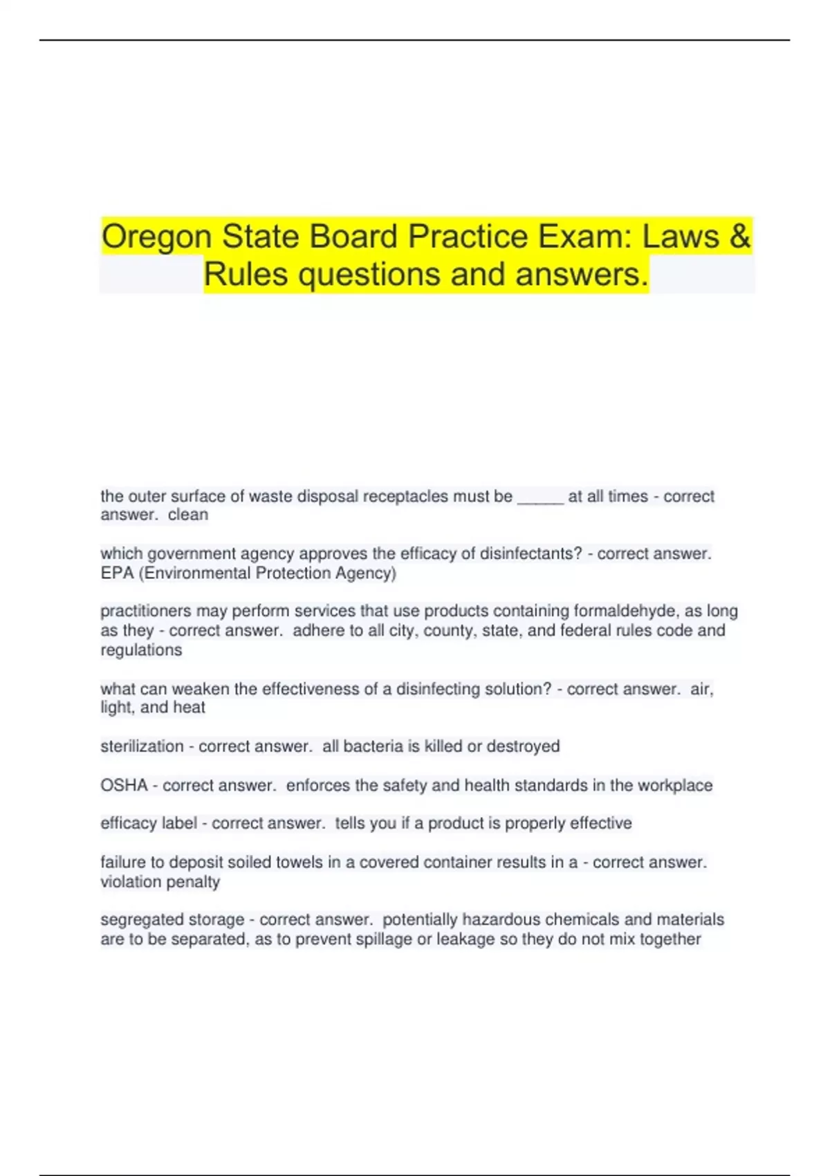 Oregon State Board Practice Exam: Laws & Rules questions and answers. the outer surface of waste disposal receptacles must be _____ at all times - correct answer. clean which government agency approves the efficacy of disinfectants? - correct answer. EPA (Environmental Protection Agency) practitioners may perform services that use products containing formaldehyde, as long as they - correct answer. adhere to all city, county, state, and federal rules code and regulations what can weaken the effectiveness of a disinfecting solution? - correct answer. air, light, and heat sterilization - correct answer. all bacteria is killed or destroyed OSHA - correct answer. enforces the safety and health standards in the workplace efficacy label - correct answer. tells you if a product is properly effective failure to deposit soiled towels in a covered container results in a - correct answer. violation penalty segregated storage - correct answer. potentially hazardous chemicals and materials are to be separated, as to prevent spillage or leakage so they do not mix together