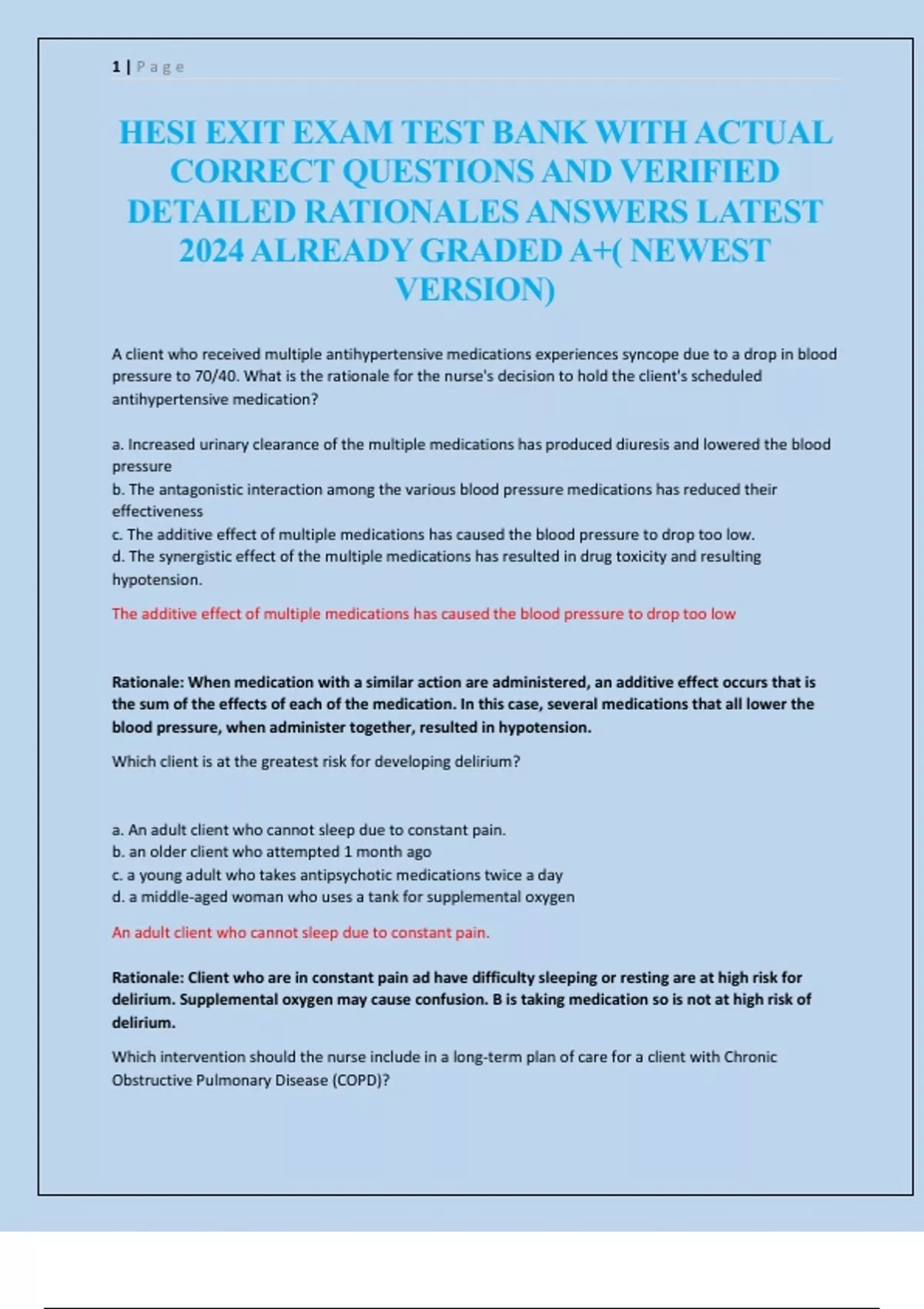 HESI EXIT EXAM TEST BANK WITH ACTUAL CORRECT QUESTIONS AND VERIFIED DETAILED RATIONALES ANSWERS LATEST 2024 ALREADY GRADED A+( NEWEST VERSION)
