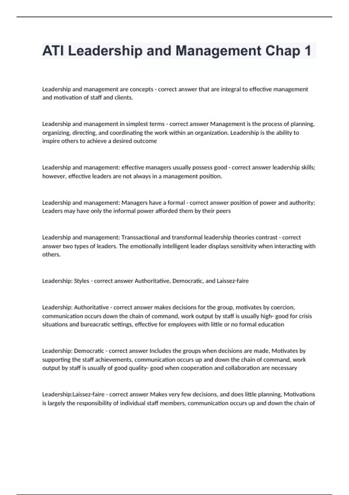 ATI Leadership and Management Chap 1Leadership and management are concepts - correct answer that are integral to effective management and motivation of staff and clients. Leadership and management in simplest terms - correct answer Management is the process of planning, organizing, directing, and coordinating the work within an organization. Leadership is the ability to inspire others to achieve a desired outcome Leadership and management: effective managers usually possess good - correct answer leadership skills; however, effective leaders are not always in a management position. Leadership and management: Managers have a formal - correct answer position of power and authority; Leaders may have only the informal power afforded them by their peers Leadership and management: Transsactional and transformal leadership theories contrast - correct answer two types of leaders. The emotionally intelligent leader displays sensitivity when interacting with others. Leadership: Styles - correct answer Authoritative, Democratic, and Laissez-faire Leadership: Authoritative - correct answer makes decisions for the group, motivates by coercion, communication occurs down the chain of command, work output by staff is usually high- good for crisis situations and bureacratic settings, effective for employees with little or no formal education Leadership: Democratic - correct answer Includes the groups when decisions are made, Motivates by supporting the staff achievements, communication occurs up and down the chain of command, work output by staff is usually of good quality- good when cooperation and collaboration are necessary Leadership:Laissez-faire - correct answer Makes very few decisions, and does little planning, Motivations is largely the responsibility of individual staff members, communication occurs up and down the chain of