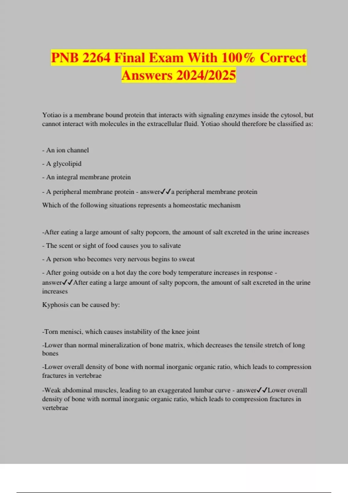 PNB 2264 Final Exam With 100% Correct Answers 2024/2025 Yotiao is a membrane bound protein that interacts with signaling enzymes inside the cytosol, but cannot interact with molecules in the extracellular fluid. Yotiao should therefore be classified as: - An ion channel - A glycolipid - An integral membrane protein - A peripheral membrane protein - answera peripheral membrane protein Which of the following situations represents a homeostatic mechanism -After eating a large amount of salty popcorn, the amount of salt excreted in the urine increases - The scent or sight of food causes you to salivate - A person who becomes very nervous begins to sweat - After going outside on a hot day the core body temperature increases in response - answerAfter eating a large amount of salty popcorn, the amount of salt excreted in the urine increases Kyphosis can be caused by: -Torn menisci, which causes instability of the knee joint -Lower than normal mineralization of bone matrix, which decreases the tensile stretch of long bones -Lower overall density of bone with normal inorganic organic ratio, which leads to compression fractures in vertebrae -Weak abdominal muscles, leading to an exaggerated lumbar curve - answerLower overall density of bone with normal inorganic organic ratio, which leads to compression fractures in vertebrae When your blood calcium level decreases below normal, this ____ is sensed by ____ in the Parathyroid gland. Osteoclasts have the role of the ____ in this control system. - feedback, the control center, receptor - stimulus, receptors, effector - set point, receptors, efferent pathway - stimulus, the afferent pathway, effector - answerstimulus, receptors, effector The pelvic girdle includes which contribution of bones? -Acetabulum and femoral head -Ilium, ischium and pubis -clavicle, scapula and humerus -clavicle, scapula and sternum - answerIlium, ischium and pubis The cervical curvature is a normal secondary postural curvature, cover anterior, that develops as an infant learns to hold their head up (true or false) - answertrue Which of the following is characteristic of water? -Water is a poor solvent, unable to mix with polar substances -the water molecule ionizes to form H2 and O- ions -water is able to mix with and dissolve lipids such as triglycerides, oils, and steroid hormones -the oxygen in the water molecule has a partial negative charge, and the hydrogen a partial positive charge - answerthe oxygen in the water molecule has a partial negative charge, and the hydrogen a partial positive charge the articulation between C-1 (atlas) and C-2 (axis) is a ____ joint that allows the movement ____ -pivot and gliding, rotation of the head to the left and right ("no" movement) -combined symphysis and gliding, slight movements in all directions -pivot, flexion and extension of the neck ("yes" movement) -double condyloid, flexion and extension of the neck ("yes" movement) - answerpivot and gliding, rotation of the head to the left and right ("no" movement) A tear in a blood vessel that exposes collagen to blood activates platelets to become sticky and activate chemical signals, which can cause more platelets to become sticky and secrete the same chemical signals. This is an example of ____ control -closed loop, negative feedback -no -closed loop, positive feedback -feed-forward -open loop, positive feedback - answerfeed-f