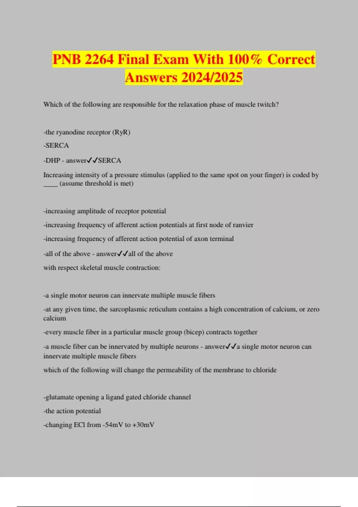 PNB 2264 Final Exam With 100% Correct Answers 2024/2025 Which of the following are responsible for the relaxation phase of muscle twitch? -the ryanodine receptor (RyR) -SERCA -DHP - answerSERCA Increasing intensity of a pressure stimulus (applied to the same spot on your finger) is coded by ____ (assume threshold is met) -increasing amplitude of receptor potential -increasing frequency of afferent action potentials at first node of ranvier -increasing frequency of afferent action potential of axon terminal -all of the above - answerall of the above with respect skeletal muscle contraction: -a single motor neuron can innervate multiple muscle fibers -at any given time, the sarcoplasmic reticulum contains a high concentration of calcium, or zero calcium -every muscle fiber in a particular muscle group (bicep) contracts together -a muscle fiber can be innervated by multiple neurons - answera single motor neuron can innervate multiple muscle fibers which of the following will change the permeability of the membrane to chloride -glutamate opening a ligand gated chloride channel -the action potential -changing ECl from -54mV to +30mV -all of the above - answerglutamate opening a ligand gated chloride channel during the power stroke phase -all of the above -ATP binds to myosin -actin moves -ATP and phosphate are bound to myosin - answeractin moves T-Tubules: -contain sarcomeres -store calcium ions -store oxygen to provide muscle with a constant supply of ATP -propagate the action potential - answerpropagate the action potential during the rise of the action potential: -sodium permeability is increasing -potassium permeability is zero -the inactivation gate is closed -all of the above - answersodium permeability is increasing myelinated axon segments are referred to as _____. Local currents travel _____ through these segments -internode, faster -node, faster -node, slower -internode, slower - answerinternode, faster which of the following is not a characteristic of neurons? -high metabolic rate -long life span -long length -mitosis - answermitosis you are interested in studying a cell under conditions where it is selectively permeable to chloride and potassium ions, but not to sodium ions. In order to look more closely at the electrical properties of the cell, you would need to perform calculations using: -the GHK equation -the nernst equation -fick's law - answerthe GHK equation in a typical neuron, the density of voltage gated channels is highest in the -dendrites -node -internode -axon hillock - answeraxon hillock in contrast to potentials developed at the motor end plate, synaptic potentials on dendrites are often -graded potentials -IPSPs -produced by voltage gated channels -due to neurotransmitter binding - answerIPSPs rapid dystonia parkinsonism results from a m