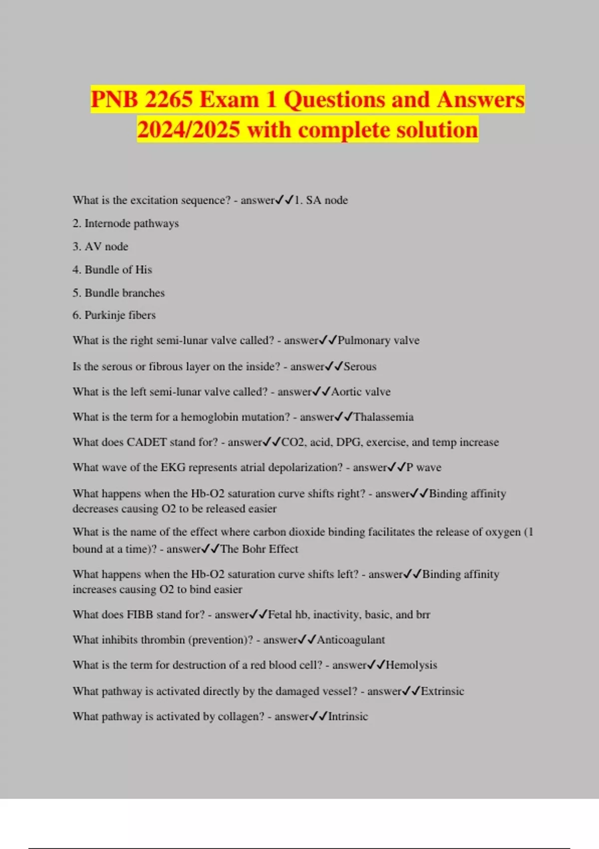 PNB 2265 Exam 1 Questions and Answers 2024/2025 with complete solution What is the excitation sequence? - answer1. SA node 2. Internode pathways 3. AV node 4. Bundle of His 5. Bundle branches 6. Purkinje fibers What is the right semi-lunar valve called? - answerPulmonary valve Is the serous or fibrous layer on the inside? - answerSerous What is the left semi-lunar valve called? - answerAortic valve What is the term for a hemoglobin mutation? - answerThalassemia What does CADET stand for? - answerCO2, acid, DPG, exercise, and temp increase What wave of the EKG represents atrial depolarization? - answerP wave What happens when the Hb-O2 saturation curve shifts right? - answerBinding affinity decreases causing O2 to be released easier What is the name of the effect where carbon dioxide binding facilitates the release of oxygen (1 bound at a time)? - answerThe Bohr Effect What happens when the Hb-O2 saturation curve shifts left? - answerBinding affinity increases causing O2 to bind easier What does FIBB stand for? - answerFetal hb, inactivity, basic, and brr What inhibits thrombin (prevention)? - answerAnticoagulant What is the term for destruction of a red blood cell? - answerHemolysis What pathway is activated directly by the damaged vessel? - answerExtrinsic What pathway is activated by collagen? - answerIntrinsic What dissolves thrombus (break down)? - answerFibrinolysis What happens during erythropoiesis? - answerGene expression changes since the nucleus and all other organelles are ejected Which wave of an EKG represents ventricle depolarization and atrial repolarization? - answerQRS wave What monomer CAN'T cross membranes? - answerIgM What monomer CAN cross membranes? - answerIgG What is the name of the effect where deoxygenation promotes carbon dioxide binding to hemoglobin (when no oxygen is bound)? - answerThe Haldane Effect What monomer is anti-A or anti-B? - answerIgM What is the name of the disease where there are too many red blood cells due to bone marrow abnormalities? - answerPolycythemia What is thrombocytopenia? - answerToo few platelets What is thrombocytosis? - answerToo many plat
