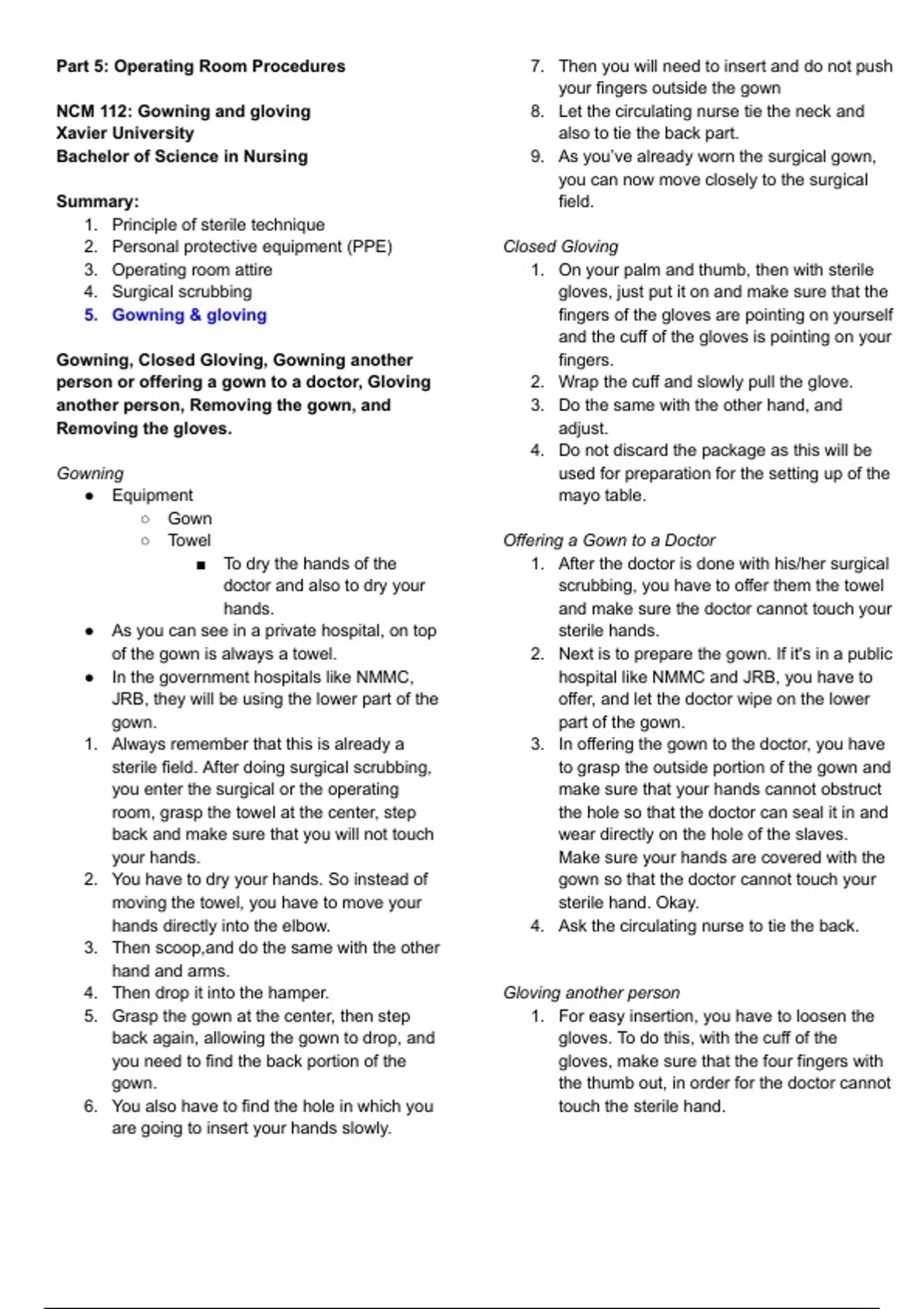Class notes Operating Room Nursing Procedures: Gowning and Gloving