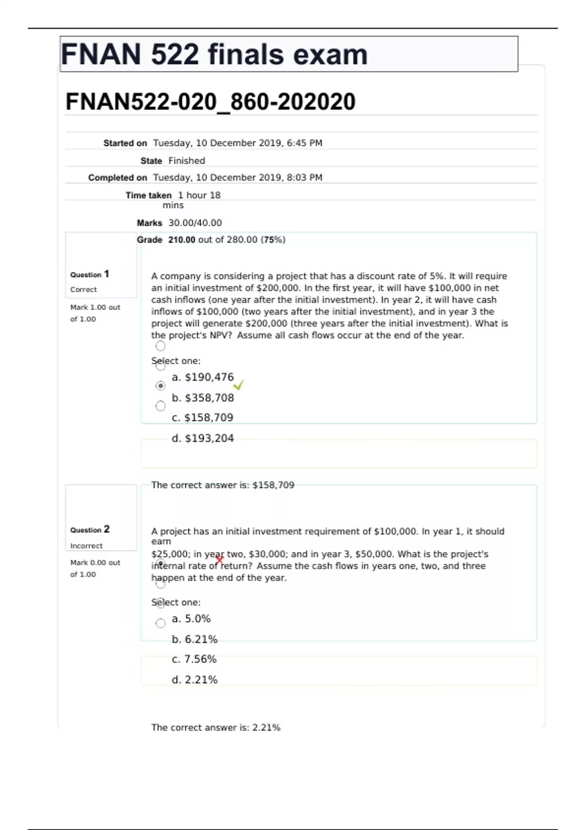 Question 1 Correct Mark 1.00 out of 1.00 Question 2 Incorrect Mark 0.00 out of 1.00 A company is considering a project that has a discount rate of 5%. It will require an initial investment of $200,000. In the first year, it will have $100,000 in net cash inflows (one year after the initial investment). In year 2, it will have cash inflows of $100,000 (two years after the initial investment), and in year 3 the project will generate $200,000 (three years after the initial investment). What is the project's NPV? Assume all cash flows occur at the end of the year. Select one: a. $190,476 b. $358,708 c. $158,709 d. $193,204 The correct answer is: $158,709 A project has an initial investment requirement of $100,000. In year 1, it should earn $25,000; in year two, $30,000; and in year 3, $50,000. What is the project's internal rate of return? Assume the cash flows in years one, two, and three happen at the end of the year. Select one: a. 5.0% b. 6.21% c. 7.56% d. 2.21% The correct answer is: 2.21% Question 3 Correct Mark 1.00 out of 1.00 Question 4 Incorrect Mark 0.00 out of 1.00 In which of the following situations would it be appropriate to use the IRR method to make an investment decision? Select one: a. To compare two projects that have an equal initial investment and lifespan. b. All of these answers. c. To assess a project which cash flows fluctuate between positive and negative. d. To compare two investments that have different durations. The correct answer is: To compare two projects that have an equal initial investment and lifespan. Under the internal rate of return rule in capital budgeting, which of the following statements CANNOT be true? Select one: a. The internal rate of return can vary throughout the life of a project. b. The internal rate of return can be equal to the cost of capital. c. The cash inflows can be estimates. d. The initial investment can be the cost from purchasing new equipment. The correct answer is: The internal rate of return can vary throughout the life of a project. Question 5 Correct Mark 1.00 out of 1.00 Question 6 Correct Mark 1.00 out of 1.00 Question 7 Correct Mark 1.00 out of 1.00 You have just been offered a contract worth $5.6 million per year for 3 years. However, to take the contract, you will need to purchase some new equipment. Your discount rate for this project is 15.3%. You are still negotiating the purchase price of the equipment. What is the most you can pay for the equipment and still have a positive NPV? Select one: a. $12.6 million b. $16.8 million c. $5.6 million d. $23.4 million The correct answer is: $12.6 million Which of the following could be a sunk cost? Select one: a. All of these answers. b. A feasibility study that attempted to determine the economic viability of a project. c. Labor hours spent on planning project. d. Equipment purchased to pursue a project. The correct answer is: All of these answers. Which of the following is an example of an opportunity cost? Select one: a. If you watch a game instead of going for a run, the cost is poorer personal health. b. All of these answers. c. If you buy a candy bar instead of a soda, the cost is thirst. d. If invest in one of two projects, the cost is the lost revenue from the other project. The correct answer is: All of these answers. Question 8 Incorrect Mark 0.00 out of 1.00 Question 9 Incorrect Mark 0.00 out of 1.00 Which of the following is the best reason to use the payback method to evaluate investments? Select one: a. The payback method covers all cash inflows and outflows for the duration of the investment. b. The payback method adjusts for the project's riskiness. c. The payback method is easy to use and understand for most people, regardless of training. d. If you use the payback method, you do not need to perform additional analyses. The correct answer is: The payback method is easy to use and understand for most people, regardless of training. You are analyzing two different investments and will present your findings to company executives. Both projects have cash flows that alternate between positive and negative. Which budgeting method should you use to evaluate the projects? Select one: a. Modified Internal Rate of Return and Net Present Value. b. Any of these choices are appropriate. c. Payback period method. d. Internal Rate of Return and Net Present Value. The correct answer is: Modified Internal Rate of Return and Net Present Value.
