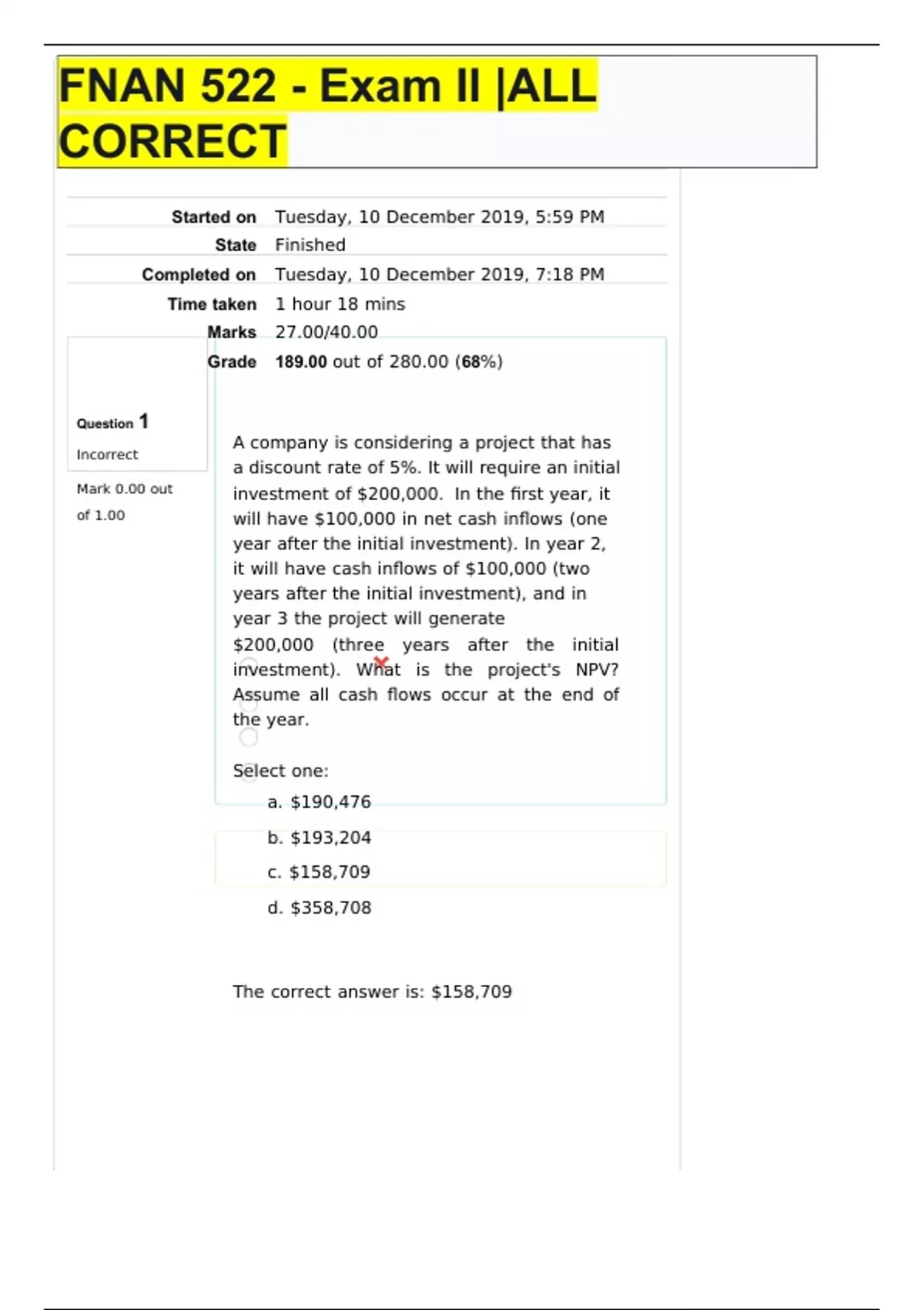 Question 1 Incorrect Mark 0.00 out of 1.00 A company is considering a project that has a discount rate of 5%. It will require an initial investment of $200,000. In the first year, it will have $100,000 in net cash inflows (one year after the initial investment). In year 2, it will have cash inflows of $100,000 (two years after the initial investment), and in year 3 the project will generate $200,000 (three years after the initial investment). What is the project's NPV? Assume all cash flows occur at the end of the year. Select one: a. $190,476 b. $193,204 c. $158,709 d. $358,708 The correct answer is: $158,709