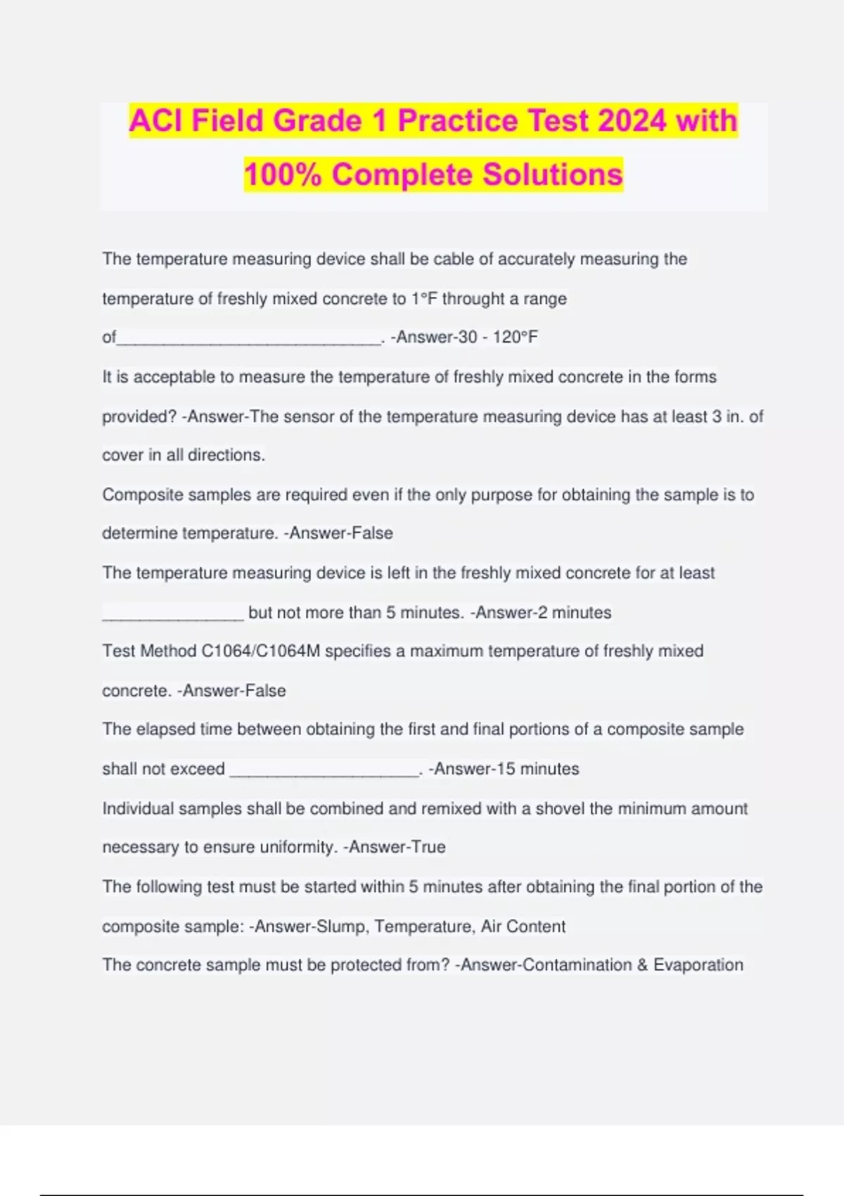 ACI Field Grade 1 Practice Test 2024 with 100% Complete Solutions The temperature measuring device shall be cable of accurately measuring the temperature of freshly mixed concrete to 1°F throught a range of____________________________. -Answer-30 - 120°F It is acceptable to measure the temperature of freshly mixed concrete in the forms provided? -Answer-The sensor of the temperature measuring device has at least 3 in. of cover in all directions. Composite samples are required even if the only purpose for obtaining the sample is to determine temperature. -Answer-False The temperature measuring device is left in the freshly mixed concrete for at least _______________ but not more than 5 minutes. -Answer-2 minutes Test Method C1064/C1064M specifies a maximum temperature of freshly mixed concrete. -Answer-False The elapsed time between obtaining the first and final portions of a composite sample shall not exceed ____________________. -Answer-15 minutes Individual samples shall be combined and remixed with a shovel the minimum amount necessary to ensure uniformity. -Answer-True The following test must be started within 5 minutes after obtaining the final portion of the composite sample: -Answer-Slump, Temperature, Air Content The concrete sample must be protected from? -Answer-Contamination & Evaporation When strength specimens are to be made, the minimum sample size is __________________. -Answer-1.0 ft3 Portions of the composite should be taken from the _______________of the batch discharge. -Answer-Middle A composite sample taken from a paving mixer consists of _______________ individual samples taken from different portions of the pile. -Answer-Five The process of removing aggregate larger than a designated size from the fresh concrete by sieving it on a sieve of the designated size is know as? -Answer-Wet Sieving The slump test is considered applicable to plastic concrete having a coarse aggregate up to ____________________. -Answer-1 1/2 in. The height of the slump mold is_________________. -Answer-12 inches The interior surface of the slump mold shall be relatively smooth and free from projections. -Answer-True The tamping rod used for the slump test shall have a minimum length of ____________ and a maximum length of _______________. -Answer-16 in. & 24 in. The slump mold is filled in ___________ layers of _______________. -Answer-3, equal volume If the concrete subsides below the top of the slump mold while rodding the top layer, the test is invalid. -Answer-False Slump is determined by measuring the vertical distance between? -Answer-The top of the mold and the original displaced center of the top surface of the specimen. Slump is reported to the nearest? -Answer-1/4 in