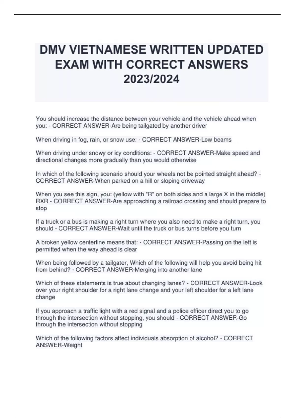 DMV VIETNAMESE WRITTEN UPDATED EXAM WITH CORRECT ANSWERS 2023/2024 You should increase the distance between your vehicle and the vehicle ahead when you: - CORRECT ANSWER-Are being tailgated by another driver When driving in fog, rain, or snow use: - CORRECT ANSWER-Low beams When driving under snowy or icy conditions: - CORRECT ANSWER-Make speed and directional changes more gradually than you would otherwise In which of the following scenario should your wheels not be pointed straight ahead? - CORRECT ANSWER-When parked on a hill or sloping driveway When you see this sign, you: (yellow with "R" on both sides and a large X in the middle) RXR - CORRECT ANSWER-Are approaching a railroad crossing and should prepare to stop If a truck or a bus is making a right turn where you also need to make a right turn, you should - CORRECT ANSWER-Wait until the truck or bus turns before you turn A broken yellow centerline means that: - CORRECT ANSWER-Passing on the left is permitted when the way ahead is clear When being followed by a tailgater, Which of the following will help you avoid being hit from behind? - CORRECT ANSWER-Merging into another lane Which of these statements is true about changing lanes? - CORRECT ANSWER-Look over your right shoulder for a right lane change and your left shoulder for a left lane change If you approach a traffic light with a red signal and a police officer direct you to go through the intersection without stopping, you should - CORRECT ANSWER-Go through the intersection without stopping Which of the following factors affect individuals absorption of alcohol? - CORRECT ANSWER-Weight