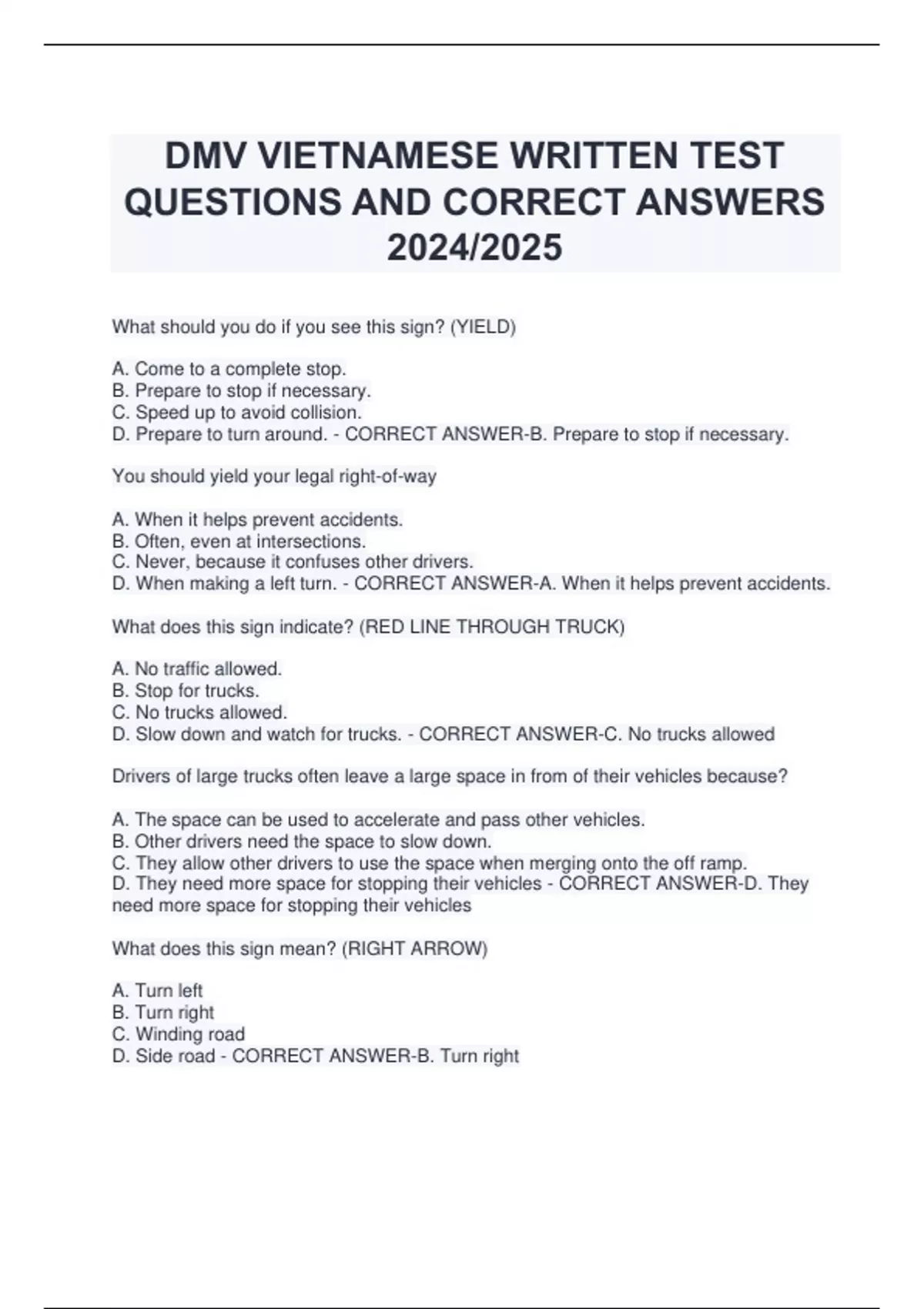 DMV VIETNAMESE WRITTEN TEST QUESTIONS AND CORRECT ANSWERS 2024/2025 What should you do if you see this sign? (YIELD) A. Come to a complete stop. B. Prepare to stop if necessary. C. Speed up to avoid collision. D. Prepare to turn around. - CORRECT ANSWER-B. Prepare to stop if necessary. You should yield your legal right-of-way A. When it helps prevent accidents. B. Often, even at intersections. C. Never, because it confuses other drivers. D. When making a left turn. - CORRECT ANSWER-A. When it helps prevent accidents. What does this sign indicate? (RED LINE THROUGH TRUCK) A. No traffic allowed. B. Stop for trucks. C. No trucks allowed. D. Slow down and watch for trucks. - CORRECT ANSWER-C. No trucks allowed Drivers of large trucks often leave a large space in from of their vehicles because? A. The space can be used to accelerate and pass other vehicles. B. Other drivers need the space to slow down. C. They allow other drivers to use the space when merging onto the off ramp. D. They need more space for stopping their vehicles - CORRECT ANSWER-D. They need more space for stopping their vehicles What does this sign mean? (RIGHT ARROW) A. Turn left B. Turn right C. Winding road D. Side road - CORRECT ANSWER-B. Turn right