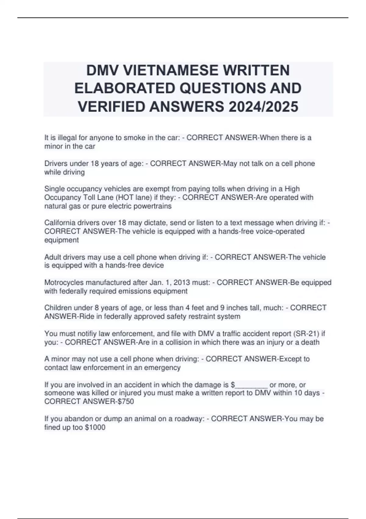 DMV VIETNAMESE WRITTEN ELABORATED QUESTIONS AND VERIFIED ANSWERS 2024/2025 It is illegal for anyone to smoke in the car: - CORRECT ANSWER-When there is a minor in the car Drivers under 18 years of age: - CORRECT ANSWER-May not talk on a cell phone while driving Single occupancy vehicles are exempt from paying tolls when driving in a High Occupancy Toll Lane (HOT lane) if they: - CORRECT ANSWER-Are operated with natural gas or pure electric powertrains California drivers over 18 may dictate, send or listen to a text message when driving if: - CORRECT ANSWER-The vehicle is equipped with a hands-free voice-operated equipment Adult drivers may use a cell phone when driving if: - CORRECT ANSWER-The vehicle is equipped with a hands-free device Motrocycles manufactured after Jan. 1, 2013 must: - CORRECT ANSWER-Be equipped with federally required emissions equipment Children under 8 years of age, or less than 4 feet and 9 inches tall, much: - CORRECT ANSWER-Ride in federally approved safety restraint system You must notifiy law enforcement, and file with DMV a traffic accident report (SR-21) if you: - CORRECT ANSWER-Are in a collision in which there was an injury or a death A minor may not use a cell phone when driving: - CORRECT ANSWER-Except to contact law enforcement in an emergency If you are involved in an accident in which the damage is $________ or more, or someone was killed or injured you must make a written report to DMV within 10 days - CORRECT ANSWER-$750 If you abandon or dump an animal on a roadway: - CORRECT ANSWER-You may be fined up too $1000 If you see an injured animal on a public roadway: - CORRECT ANSWER-Call 911 or CHP (California Highway Patrol) If you sell or transfer your vehicle to another person, you must report it to DMV: - CORRECT ANSWER-Within 5 days If you violate a restriction on your license: - CORRE