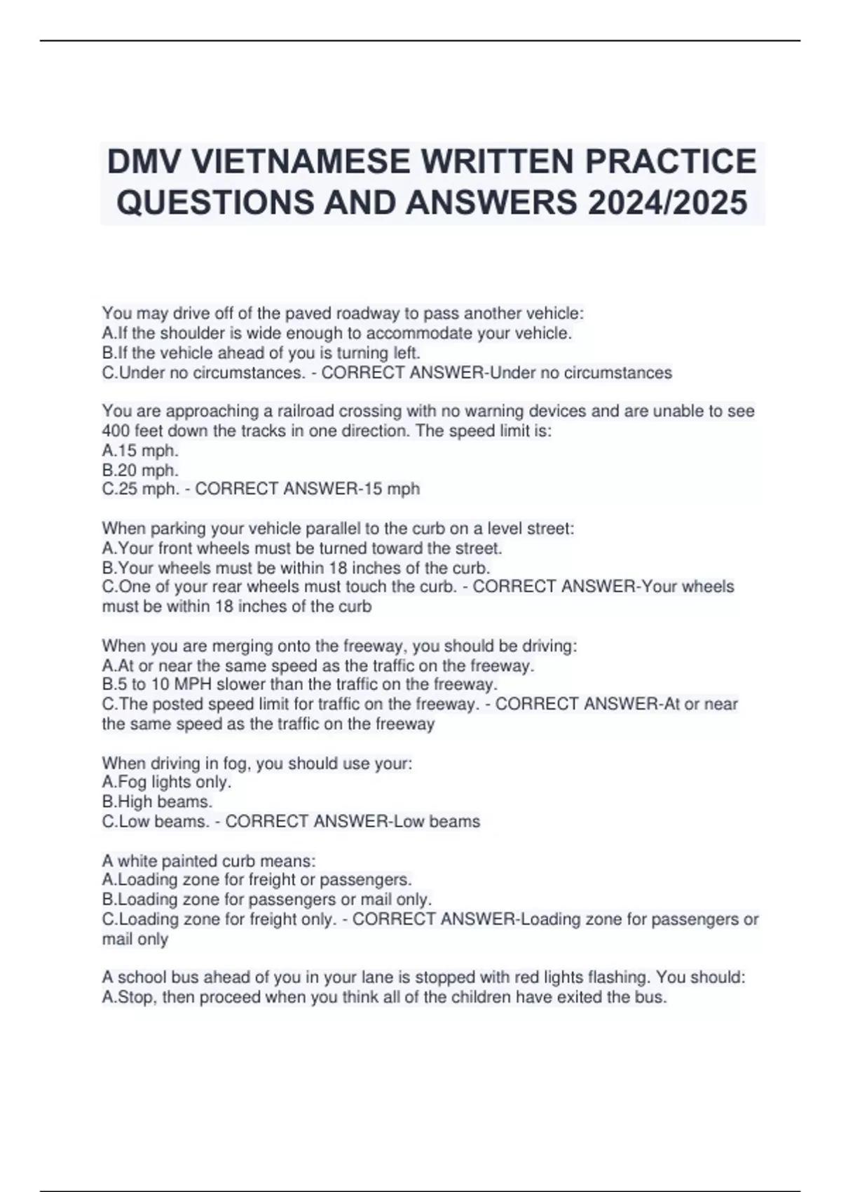 DMV VIETNAMESE WRITTEN PRACTICE QUESTIONS AND ANSWERS 2024/2025 You may drive off of the paved roadway to pass another vehicle: A.If the shoulder is wide enough to accommodate your vehicle. B.If the vehicle ahead of you is turning left. C.Under no circumstances. - CORRECT ANSWER-Under no circumstances You are approaching a railroad crossing with no warning devices and are unable to see 400 feet down the tracks in one direction. The speed limit is: A.15 mph. B.20 mph. C.25 mph. - CORRECT ANSWER-15 mph When parking your vehicle parallel to the curb on a level street: A.Your front wheels must be turned toward the street. B.Your wheels must be within 18 inches of the curb. C.One of your rear wheels must touch the curb. - CORRECT ANSWER-Your wheels must be within 18 inches of the curb When you are merging onto the freeway, you should be driving: A.At or near the same speed as the traffic on the freeway. B.5 to 10 MPH slower than the traffic on the freeway. C.The posted speed limit for traffic on the freeway. - CORRECT ANSWER-At or near the same speed as the traffic on the freeway When driving in fog, you should use your: A.Fog lights only. B.High beams. C.Low beams. - CORRECT ANSWER-Low beams A white painted curb means: A.Loading zone for freight or passengers. B.Loading zone for passengers or mail only. C.Loading zone for freight only. - CORRECT ANSWER-Loading zone for passengers or mail only A school bus ahead of you in your lane is stopped with red lights flashing. You should: A.Stop, then proceed when you think all of the children have exited the bus. B.Slow to 25 MPH and pass cautiously. C.Stop as long as the red lights are flashing. - CORRECT ANSWER-Stop as long as the red lights are flashing You just sold your vehicle. You must notify the DMV within ___ days. A.5 B.10 C.15 - CORRECT ANSWER-5 California's "Basic Speed Law" says: A.You should never drive faster than posted speed limits. B.You should never drive faster than is safe for current conditions. C.The maximum speed limit in California is 70 mph on certain freeways. - CORRECT ANSWER-You should never drive faster than is safe for current conditions To avoid last minute moves, you should be looking down the road to where your vehicle will be in about ______________. A.5 to 10 seconds B.10 to 15 seconds C.15 to 20 seconds - CORRECT ANSWER-10 or 15 seconds You are about to make a left turn. You must signal continuously during the