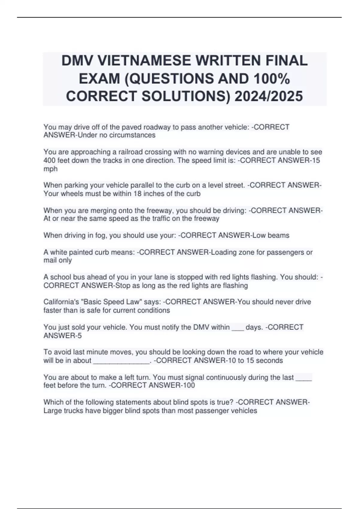 DMV VIETNAMESE WRITTEN FINAL EXAM (QUESTIONS AND 100% CORRECT SOLUTIONS) 2024/2025 You may drive off of the paved roadway to pass another vehicle: -CORRECT ANSWER-Under no circumstances You are approaching a railroad crossing with no warning devices and are unable to see 400 feet down the tracks in one direction. The speed limit is: -CORRECT ANSWER-15 mph When parking your vehicle parallel to the curb on a level street. -CORRECT ANSWERYour wheels must be within 18 inches of the curb When you are merging onto the freeway, you should be driving: -CORRECT ANSWERAt or near the same speed as the traffic on the freeway When driving in fog, you should use your: -CORRECT ANSWER-Low beams A white painted curb means: -CORRECT ANSWER-Loading zone for passengers or mail only A school bus ahead of you in your lane is stopped with red lights flashing. You should: - CORRECT ANSWER-Stop as long as the red lights are flashing California's "Basic Speed Law" says: -CORRECT ANSWER-You should never drive